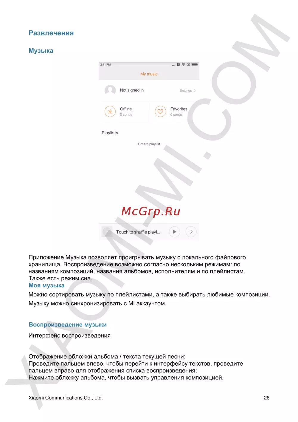 Развлечения Музыка 2 41 PM H C3 M My music Not signed in Offline _ y 0 songs Favorites ___ y 0 songs Playlists Create playlist Touch to shuffle playl Приложение Музыка позволяет проигрывать музыку с локального файлового хранилища Воспроизведение возможно согласно нескольким режимам по названиям композиций названия альбомов исполнителям и по плейлистам Также есть режим сна Моя музыка Можно сортировать музыку по плейлистами а также выбирать любимые композиции Музыку можно синхронизировать с М аккаунтом Воспроизведение музыки Интерфейс воспроизведения Отображение обложки альбома текста текущей песни Проведите пальцем влево чтобы перейти к интерфейсу текстов проведите пальцем вправо для отображения списка воспроизведения Нажмите обложку альбома чтобы вызвать управления композицией Xiaomi Communications Со Ltd 26