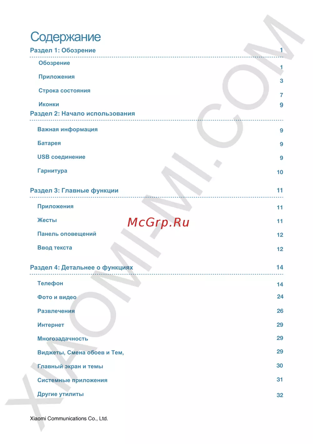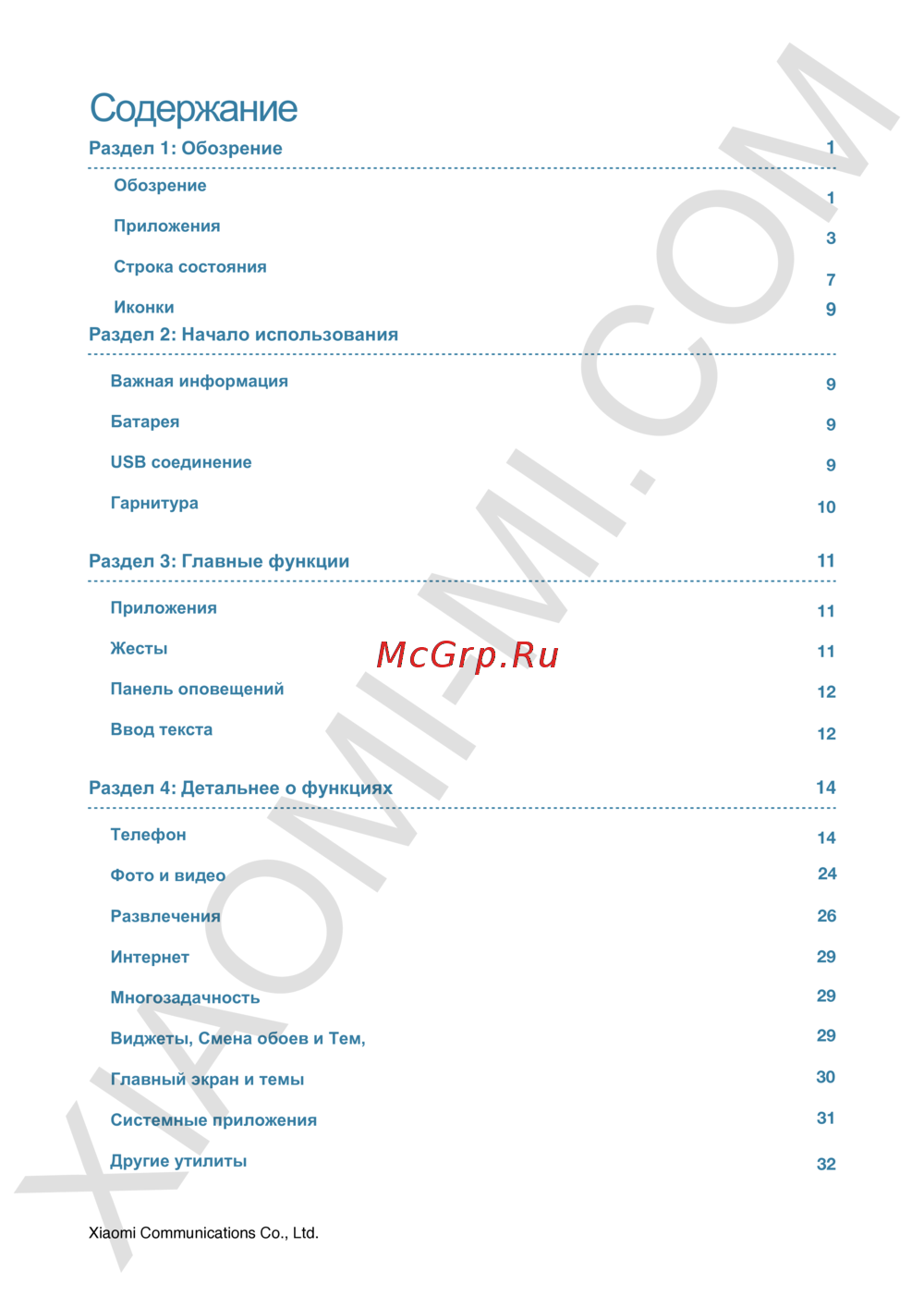 Содержание Раздел 1 Обозрение Обозрение Приложения Строка состояния Иконки 3 7 9 Раздел 2 Начало использования Важная информация 9 Батарея 9 USB соединение 9 Гарнитура Раздел 3 Главные функции 10 11 Приложения 11 Жесты 11 Панель оповещений 12 Ввод текста 12 Раздел 4 Детальнее о функц 14 Телефон 14 Фото и видео 24 Развлечения 26 Интернет 29 Многозадачность 29 Виджеты Смена обоев и Тем 29 Главный экран и темы 30 Системные приложения 31 Другие утилиты 32 Xiaomi Communications Со Ltd
