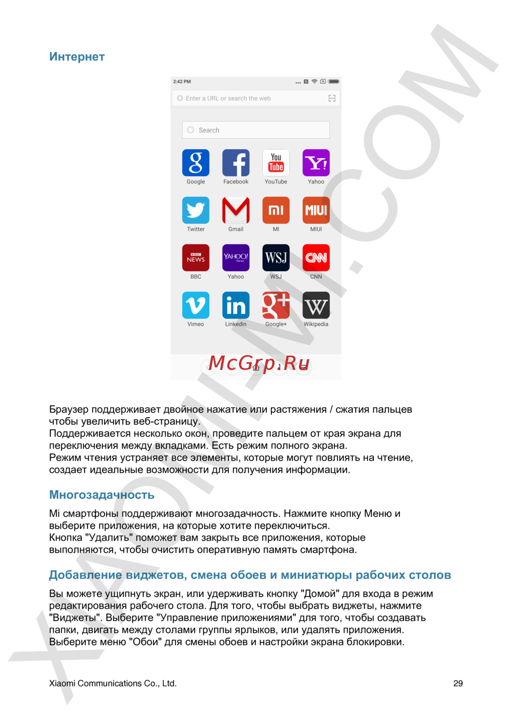 Интернет 2 42 PM Ш 3 О1 Браузер поддерживает двойное нажатие или растяжения сжатия пальцев чтобы увеличить веб страницу Поддерживается несколько окон проведите пальцем от края экрана для переключения между вкладками Есть режим полного экрана Режим чтения устраняет все элементы которые могут повлиять на чтение создает идеальные возможности для получения информации Многозадачность М1 смартфоны поддерживают многозадачность Нажмите кнопку Меню и выберите приложения на которые хотите переключиться Кнопка Удалить поможет вам закрыть все приложения которые выполняются чтобы очистить оперативную память смартфона Добавление виджетов смена обоев и миниатюры рабочих столов Вы можете ущипнуть экран или удерживать кнопку Домой для входа в режим редактирования рабочего стола Для того чтобы выбрать виджеты нажмите Виджеты Выберите Управление приложениями для того чтобы создавать папки двигать между столами группы ярлыков или удалять приложения Выберите меню Обои для смены обоев и настройки экрана блокировки Xiaomi Communications Со Ltd 29