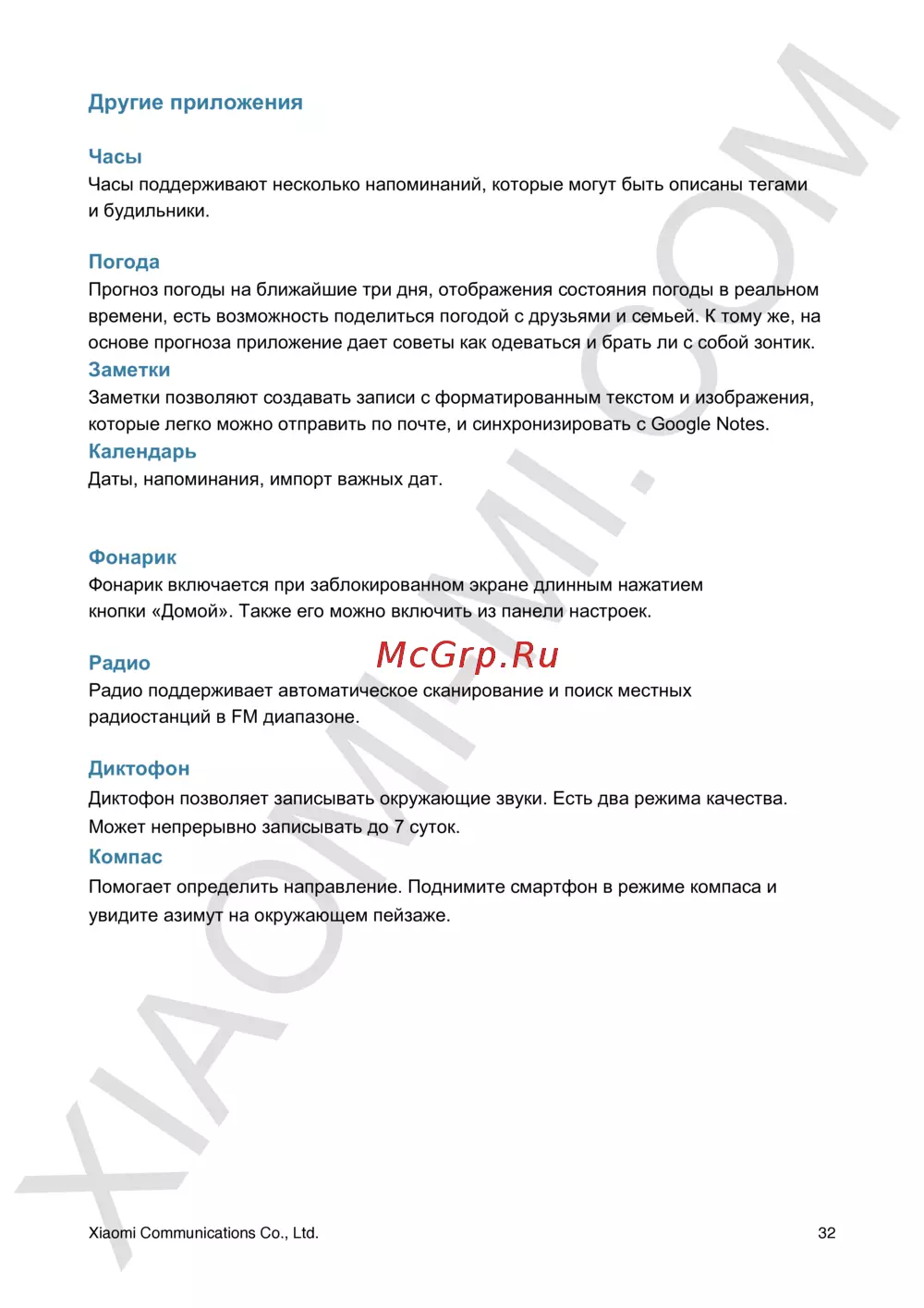 Другие приложения Часы Часы поддерживают несколько напоминаний которые могут быть описаны тегами и будильники Погода Прогноз погоды на ближайшие три дня отображения состояния погоды в реальном времени есть возможность поделиться погодой с друзьями и семьей К тому же на основе прогноза приложение дает советы как одеваться и брать ли с собой зонтик Заметки Заметки позволяют создавать записи с форматированным текстом и изображения которые легко можно отправить по почте и синхронизировать с Google Notes Календарь Даты напоминания импорт важных дат Фонарик Фонарик включается при заблокированном экране длинным нажатием кнопки Домой Также его можно включить из панели настроек Радио Радио поддерживает автоматическое сканирование и поиск местных радиостанций в FM диапазоне Диктофон Диктофон позволяет записывать окружающие звуки Есть два режима качества Может непрерывно записывать до 7 суток Компас Помогает определить направление Поднимите смартфон в режиме компаса и увидите азимут на окружающем пейзаже Xiaomi Communications Со Ltd 32