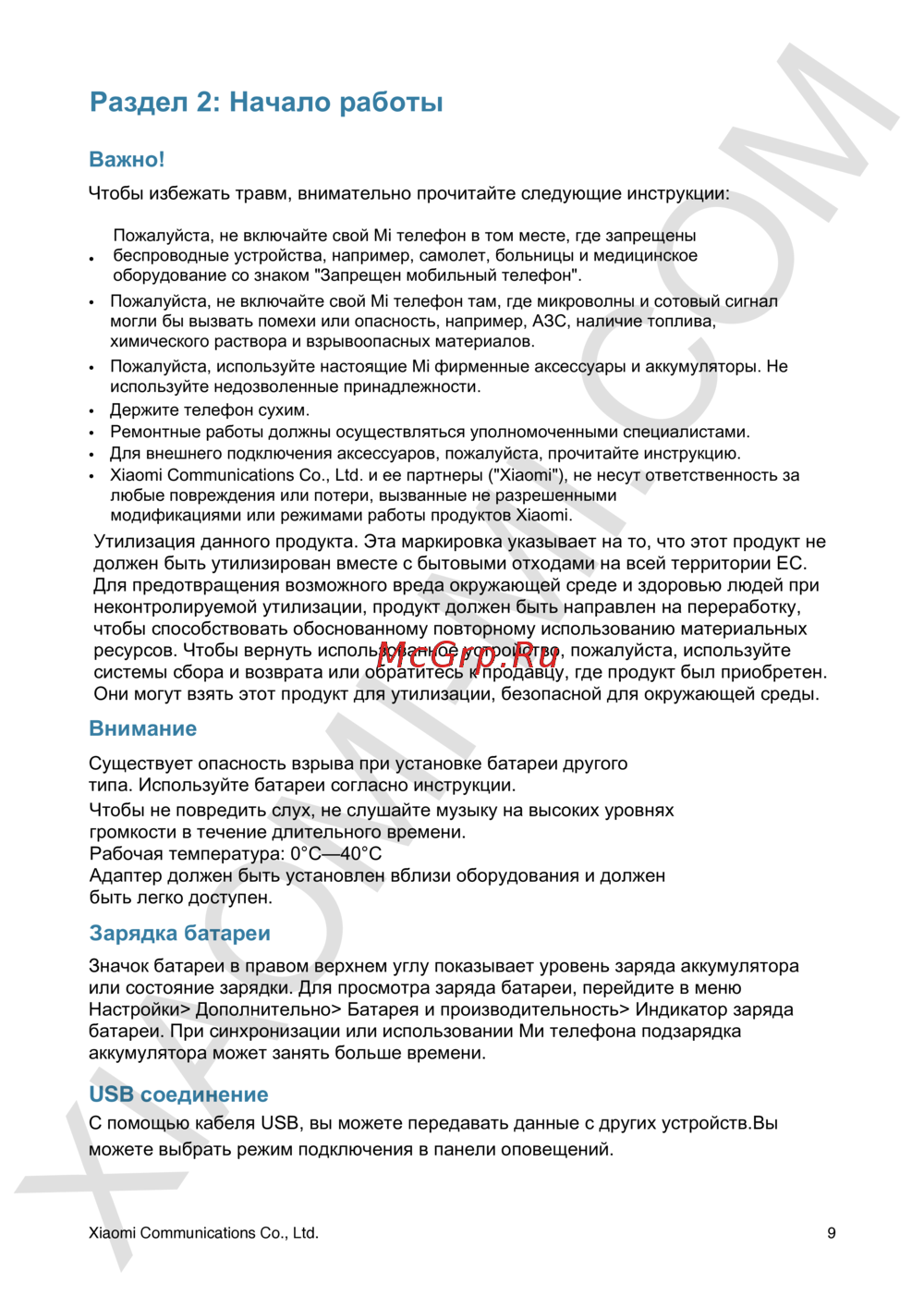 Раздел 2 Начало работы Важно Чтобы избежать травм внимательно прочитайте следующие инструкции Пожалуйста не включайте свой Mi телефон в том месте где запрещены беспроводные устройства например самолет больницы и медицинское оборудование со знаком Запрещен мобильный телефон Пожалуйста не включайте свой Mi телефон там где микроволны и сотовый сигнал могли бы вызвать помехи или опасность например АЗС наличие топлива химического раствора и взрывоопасных материалов Пожалуйста используйте настоящие Mi фирменные аксессуары и аккумуляторы Не используйте недозволенные принадлежности Держите телефон сухим Ремонтные работы должны осуществляться уполномоченными специалистами Для внешнего подключения аксессуаров пожалуйста прочитайте инструкцию Xiaomi Communications Со Ltd и ее партнеры Xiaomi не несут ответственность за любые повреждения или потери вызванные не разрешенными модификациями или режимами работы продуктов Xiaomi Утилизация данного продукта Эта маркировка указывает на то что этот продукт не должен быть утилизирован вместе с бытовыми отходами на всей территории ЕС Для предотвращения возможного вреда окружающей среде и здоровью людей при неконтролируемой утилизации продукт должен быть направлен на переработку чтобы способствовать обоснованному повторному использованию материальных ресурсов Чтобы вернуть использованное устройство пожалуйста используйте системы сбора и возврата или обратитесь к продавцу где продукт был приобретен Они могут взять этот продукт для утилизации безопасной для окружающей среды Внимание Существует опасность взрыва при установке батареи другого типа Используйте батареи согласно инструкции Чтобы не повредить слух не слушайте музыку на высоких уровнях громкости в течение длительного времени Рабочая температура 0 С 40 С Адаптер должен быть установлен вблизи оборудования и должен быть легко доступен Зарядка батареи Значок батареи в правом верхнем углу показывает уровень заряда аккумулятора или состояние зарядки Для просмотра заряда батареи перейдите в меню Настройки Дополнительно Батарея и производительность Индикатор заряда батареи При синхронизации или использовании Ми телефона подзарядка аккумулятора может занять больше времени USB соединение С помощью кабеля USB вы можете передавать данные с других устройств Вы можете выбрать режим подключения в панели оповещений Xiaomi Communications Со Ltd 9