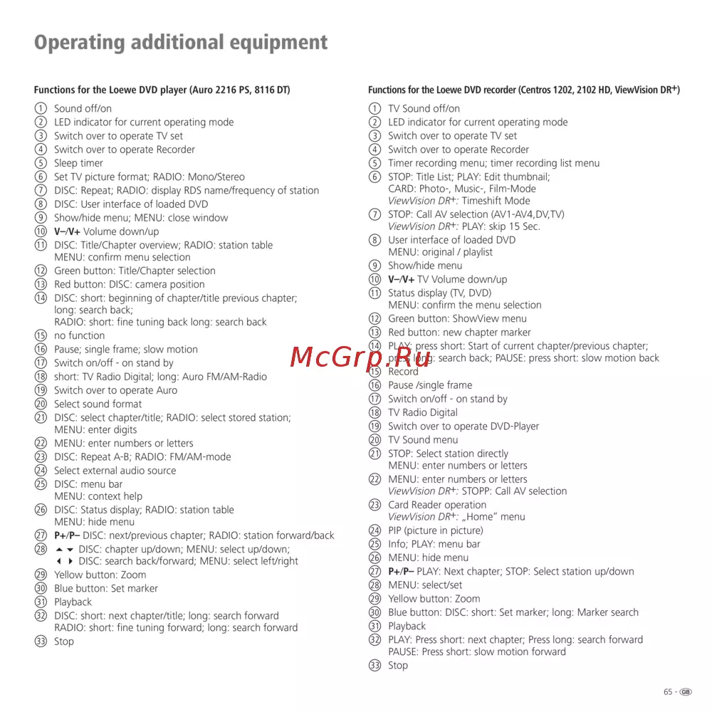 Functions for the Loewe DVD player (Auro 2216 PS, 8116 DT)