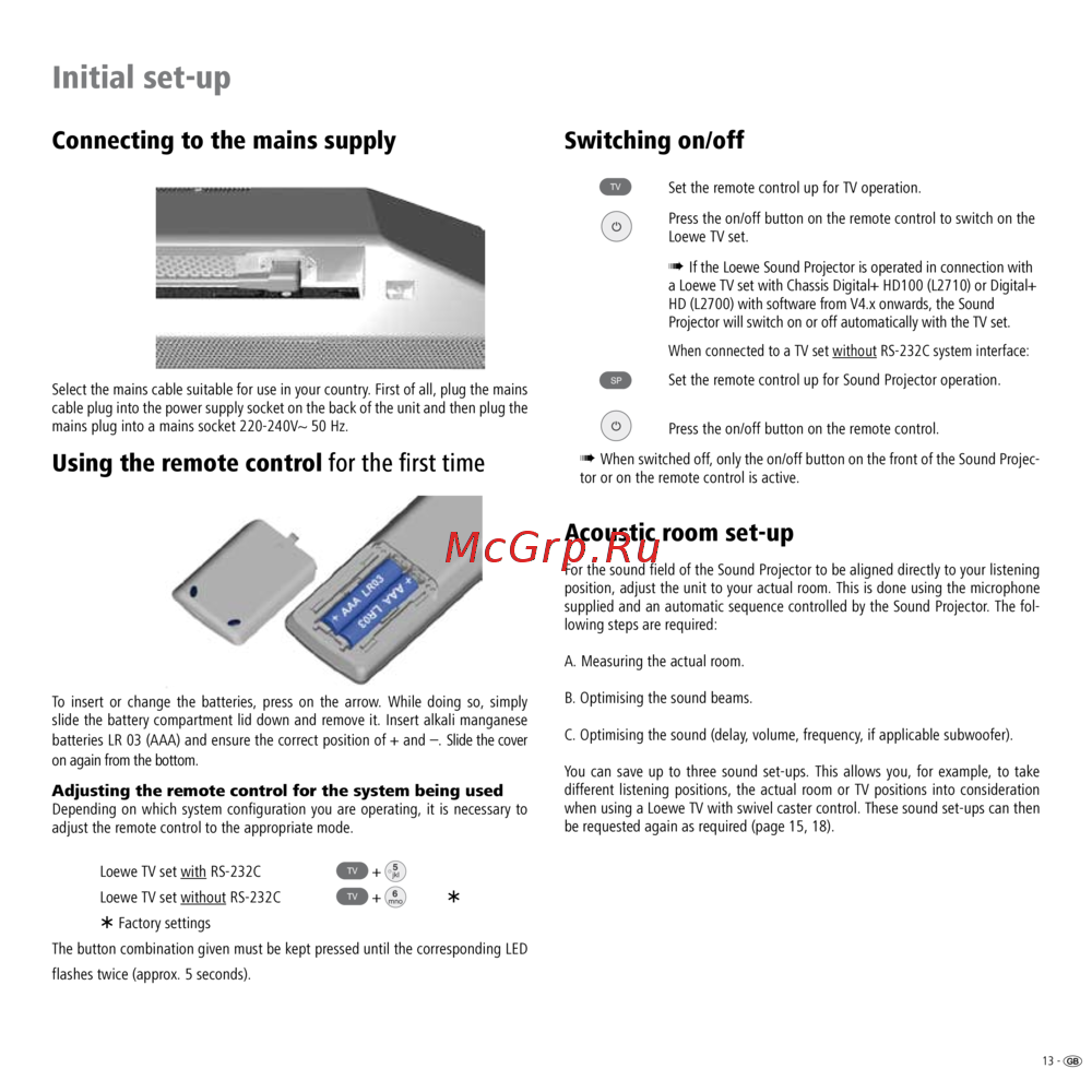 - Press the on off button on the remote control to switch on the loewe tv set and the sound projector p.15