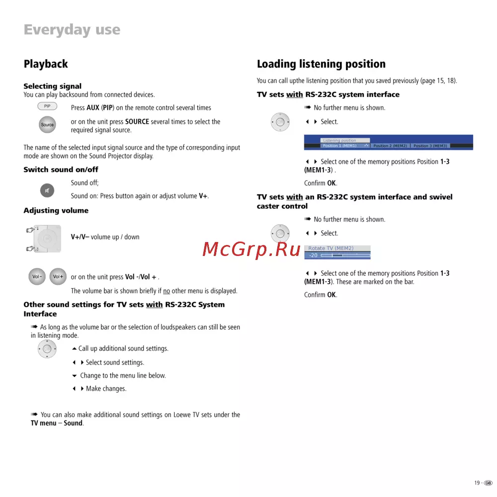 - Saving sound set up you can save up to three sound set ups this allows you for example to take different listening positions the actual room or tv positions into consideration when using a loewe tv with swivel caster control you can than call up these sound set ups at any time p.18