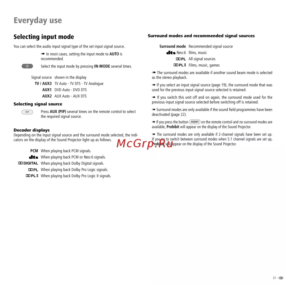 - You will find information on operating the sound projector from page 19 onwards p.18
