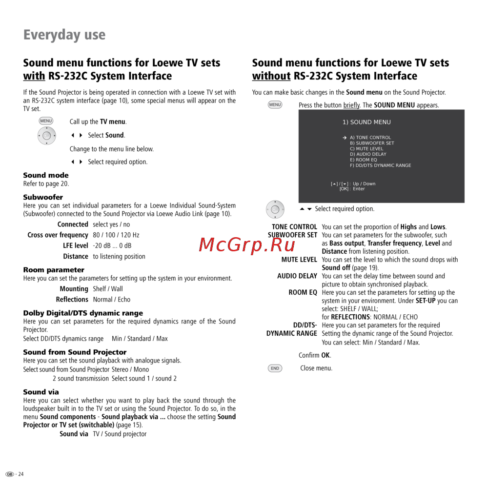 - Sound menu functions for loewe tv sets without rs 232c system interface p.24