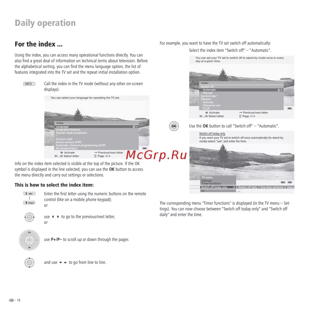 Узнайте, как использовать индекс меню для настройки функций телевизора, включая автоматическое выключение и выбор языка. Легкие шаги для удобного управления.
