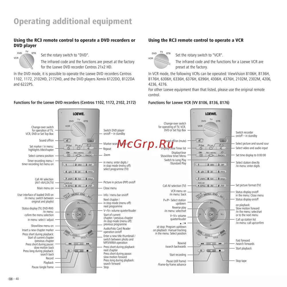 - In the dvd mode it is possible to operate the loewe dvd recorders centros 1102 1172 2102hd 2172hd and the dvd players xemix 6122do 8122da and 6222ps p.40
