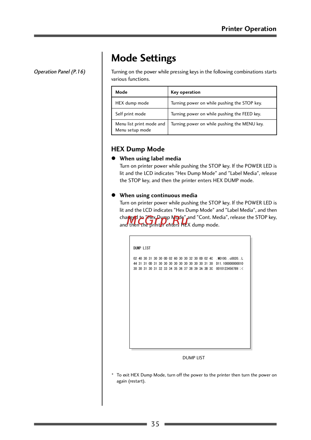 * To exit HEX Dump Mode, turn off the power to the printer then turn the power on
