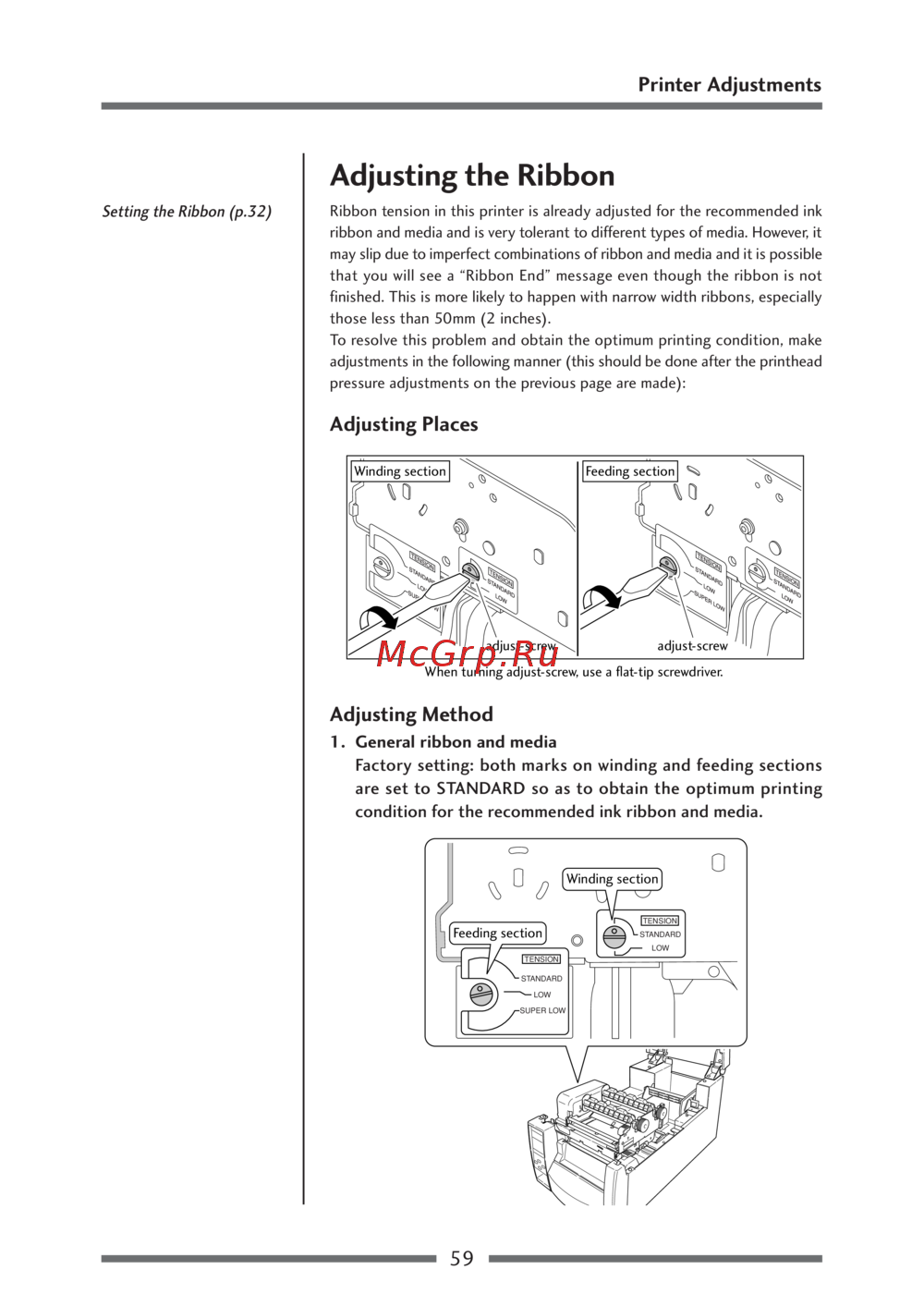 - General ribbon and media factory setting both marks on winding and feeding sections are set to standard so as to obtain the optimum printing condition for the recommended ink ribbon and media p.59