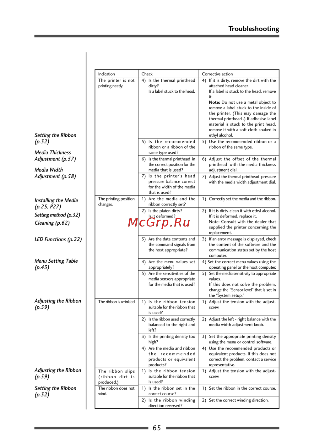 - Setting the ribbon p 2 installing the media p 5 p27 setting method p 2 menu setting table p 3 cleaning p 2 p.64