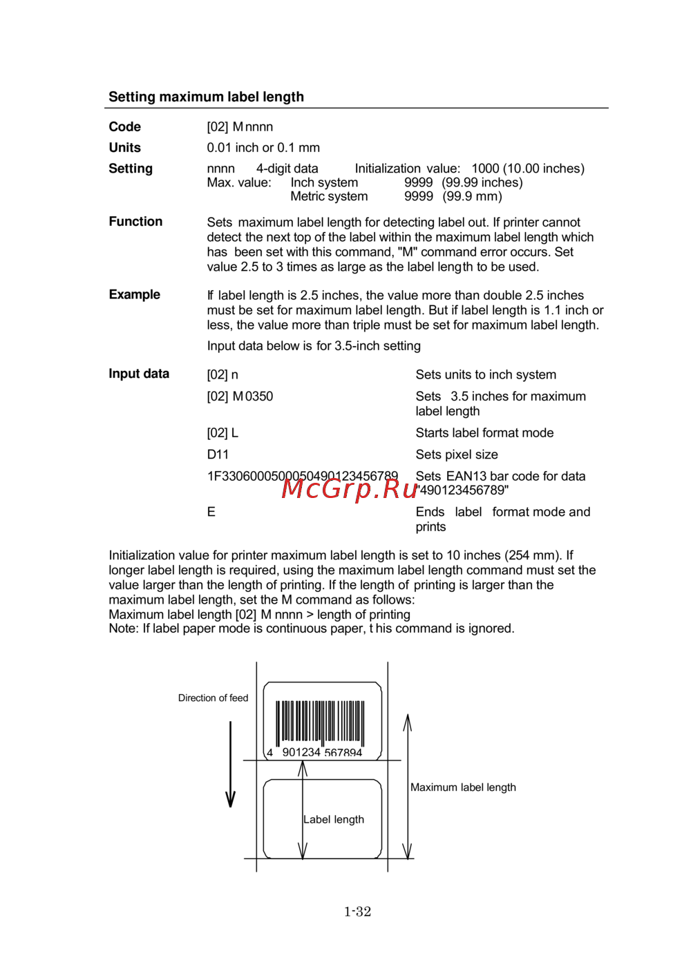 Initialization value for printer maximum label length is set to 10 inches (254 mm). If