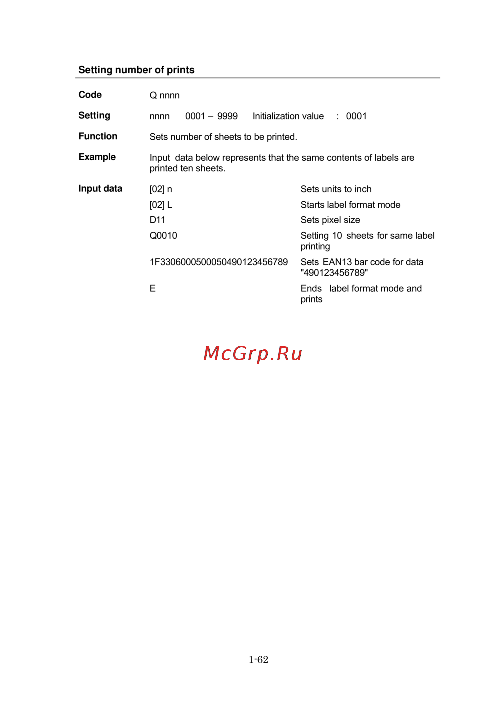 1F3306000500050490123456789 Sets EAN13 bar code for data