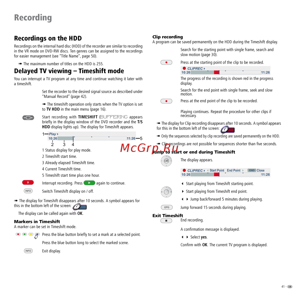 ➠ The display for Timeshift disappears after 10 seconds. A symbol appears for