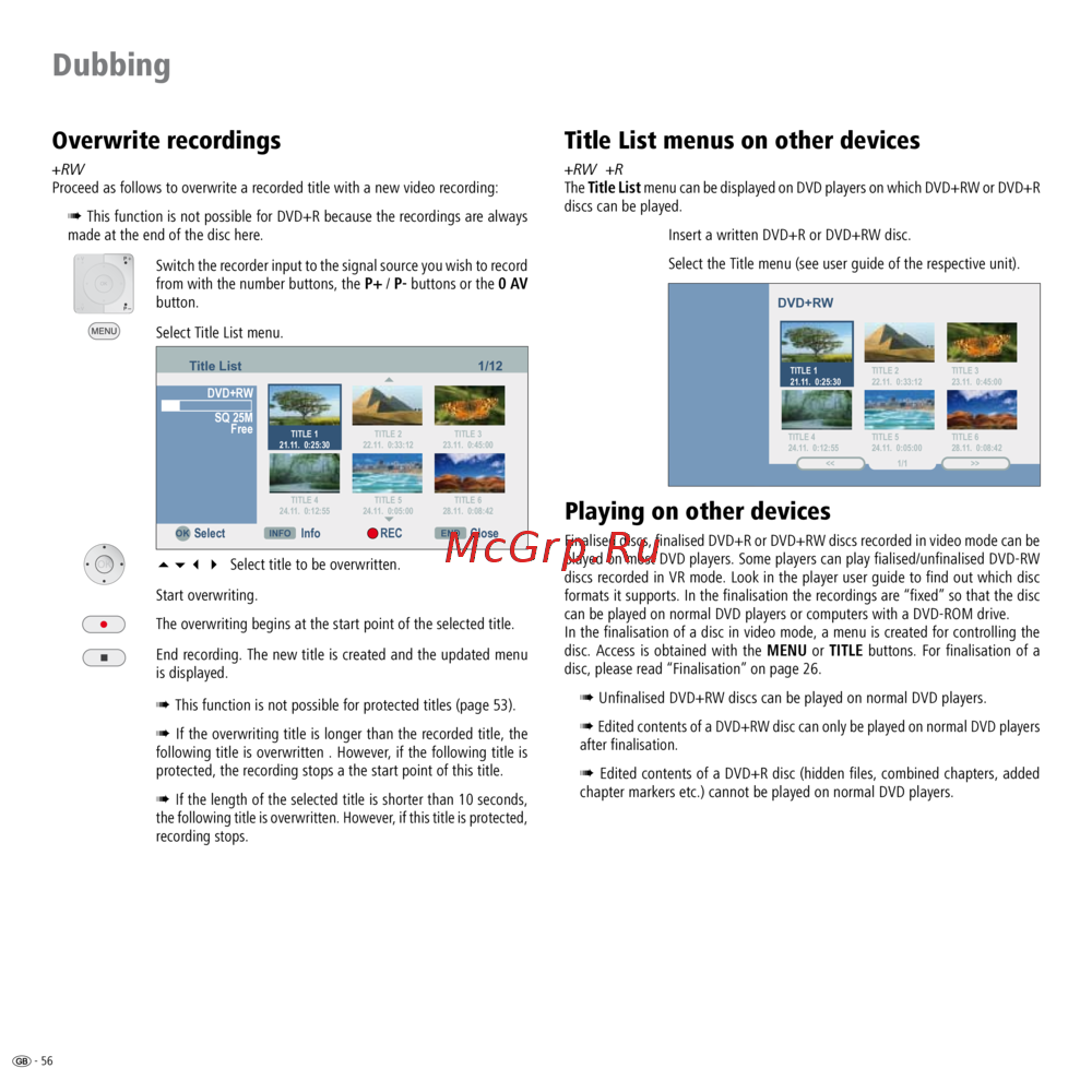 ➠ Unfinalised DVD+RW discs can be played on normal DVD players.