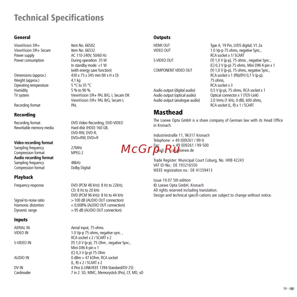 Loewe Viewvision DR+ [59/66] Technical specifications