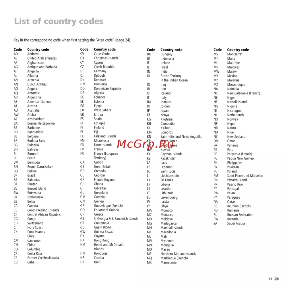 - Key in the corresponding code when first setting the area code page 4 p.63