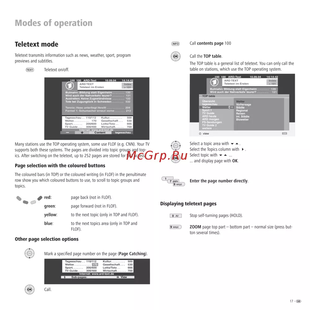 - Page selection with the coloured buttons p.17