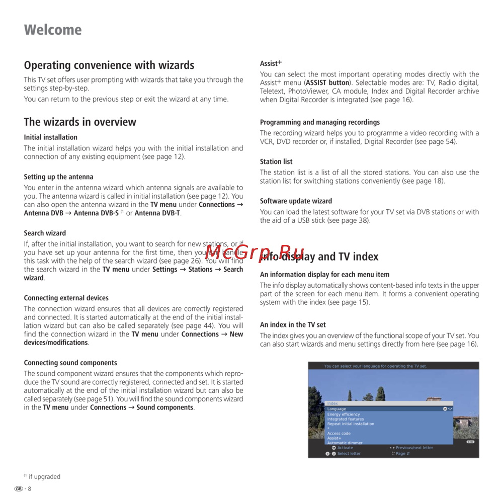 The index gives you an overview of the functional scope of your TV set. You