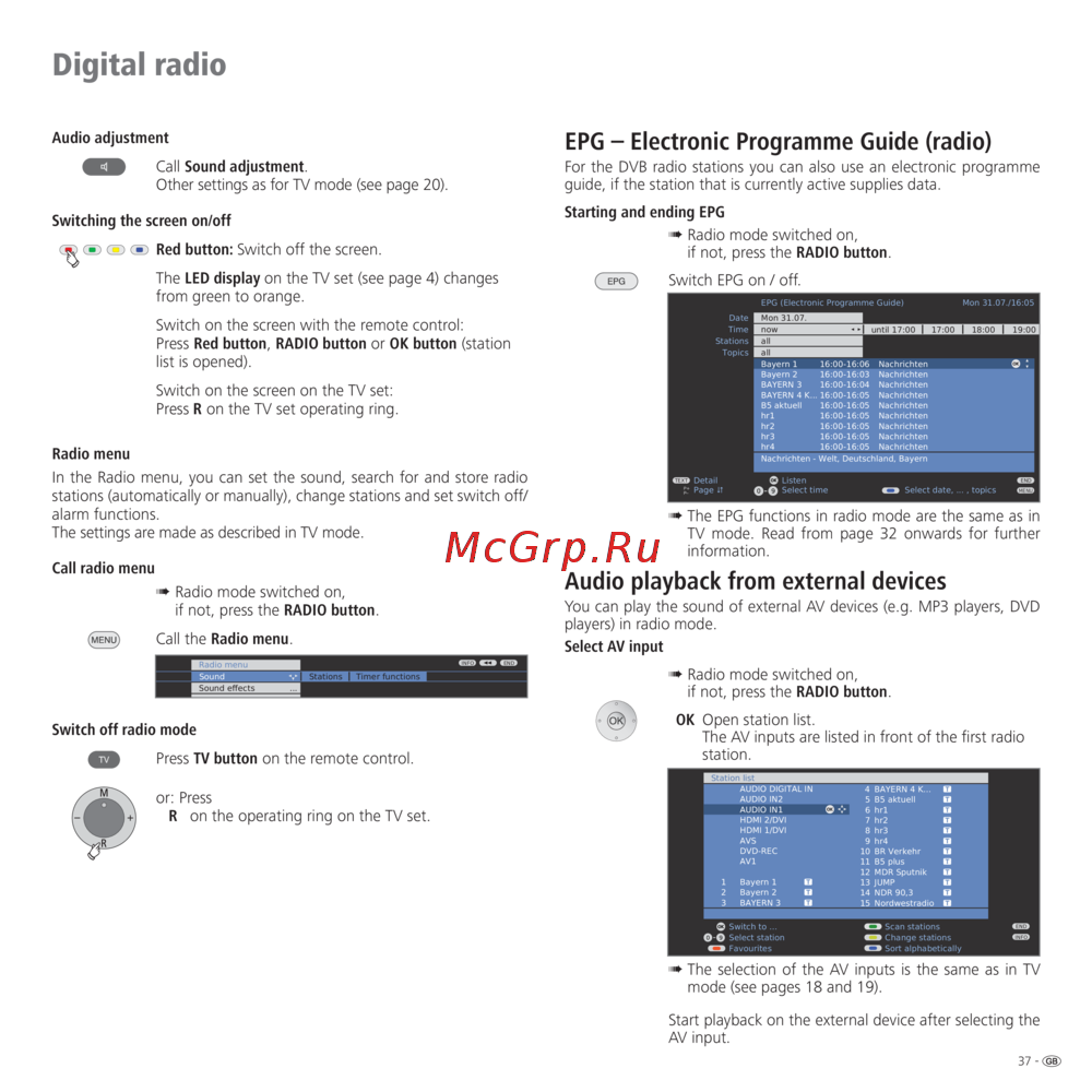 - Starting and ending epg radio mode switched on if not press the radio button p.37
