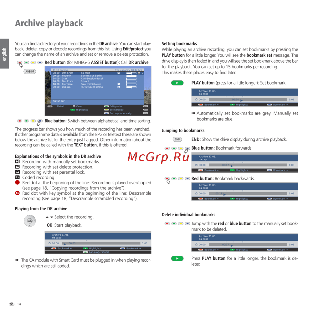 Red button (for MHEG-5 ASSIST button): Call DR archive.