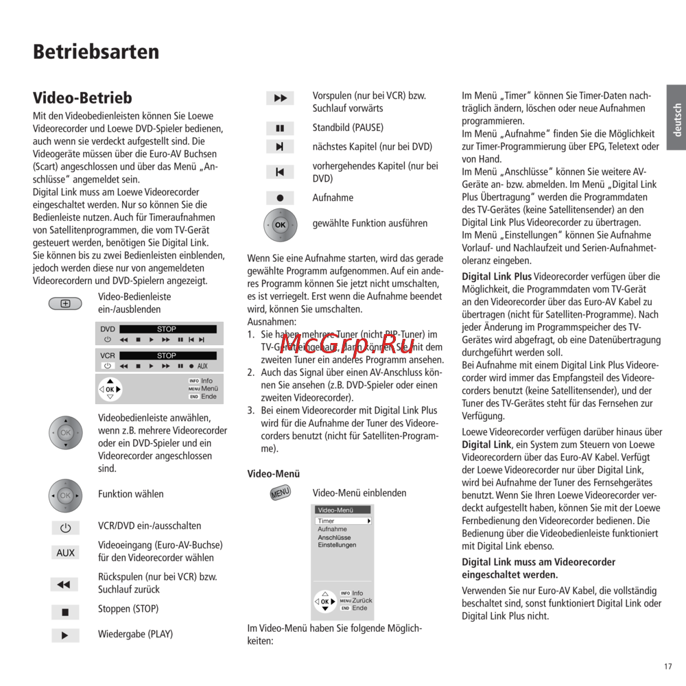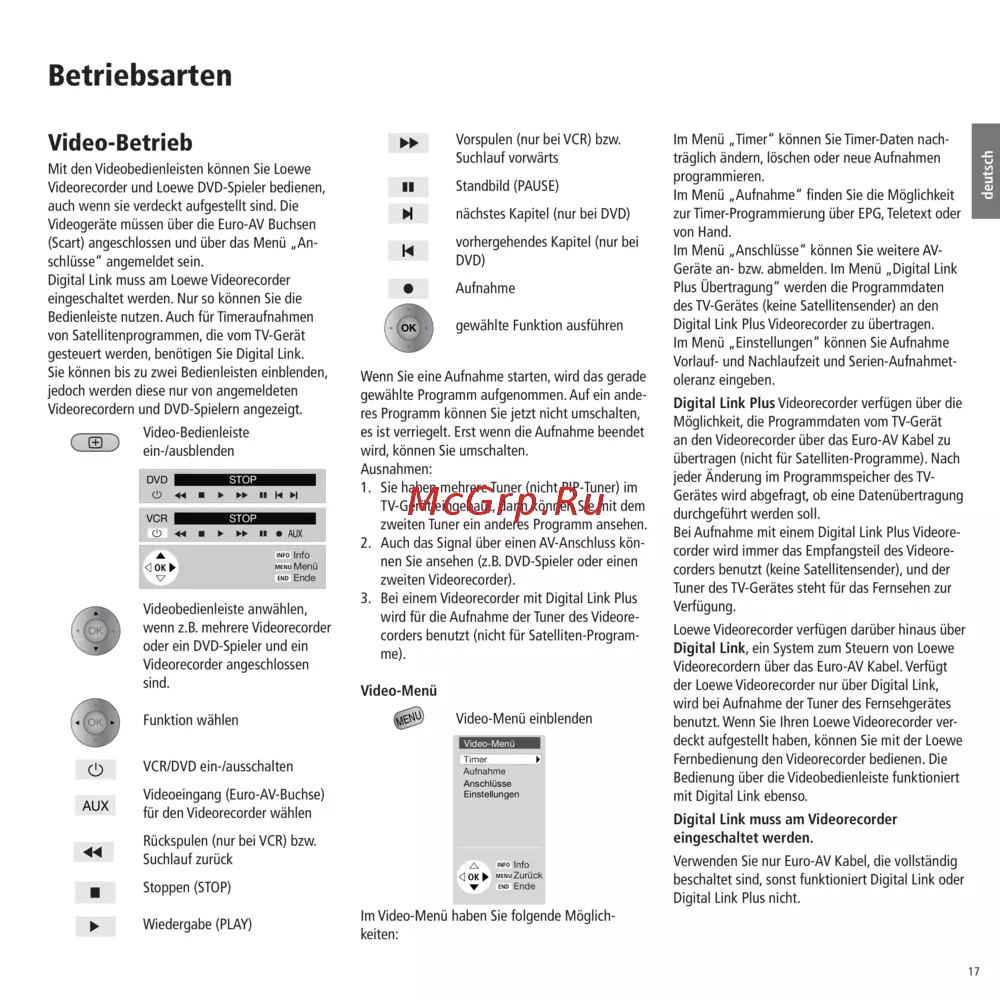 - Loewe videorecorder und loewe dvd spieler direkt bedienen sie können die fernbedienung des tv gerätes zum bedienen von loewe videorecordern und loewe dvd spielern umschalten diese geräte können sie direkt bedienen oder bei verdeckt auf ge stell ten geräten über das tv gerät dann muss am videorecorder und am dvd spieler die funktion digital link eingeschaltet werden p.20