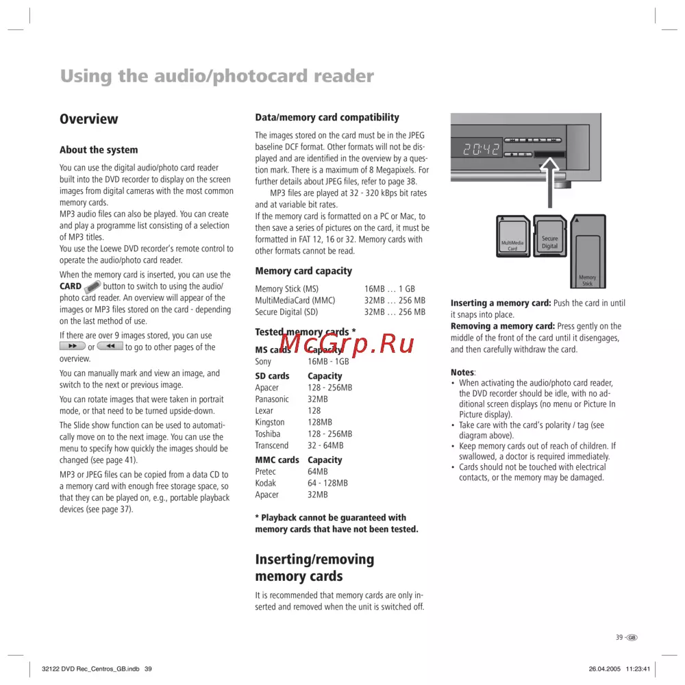 Узнайте, как использовать встроенный кардридер для отображения изображений и воспроизведения MP3-файлов на DVD-рекордере. Подробная информация о совместимости карт и настройках.