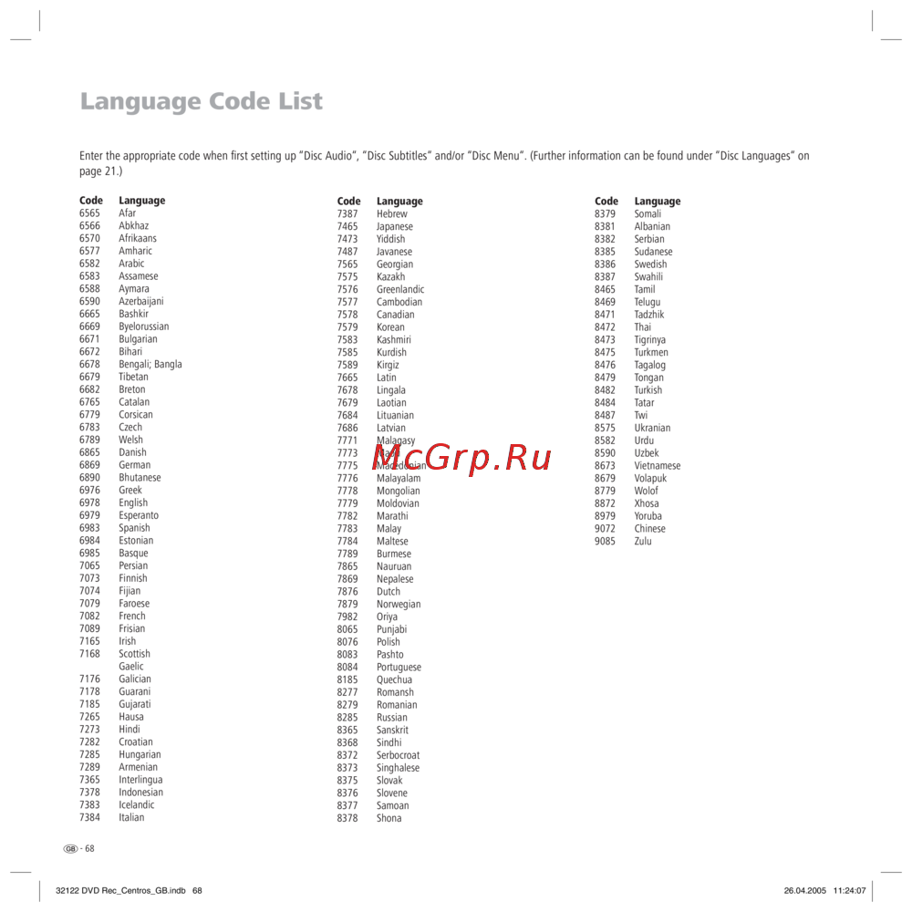 - Enter the appropriate code when fi rst setting up disc audio disc subtitles and or disc menu further information can be found under disc languages on page 21 p.68