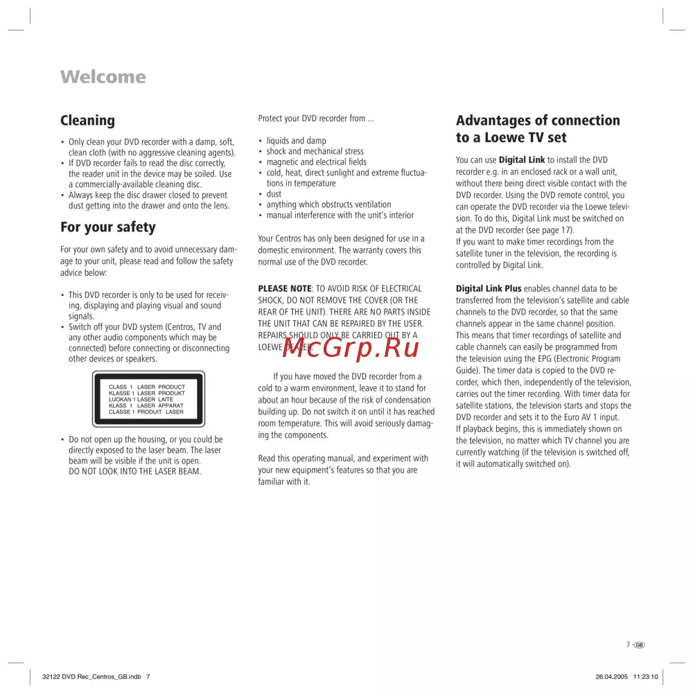 Loewe Centros 1102 — уход за DVD-рекордером: советы по чистке и безопасности [7/70]
