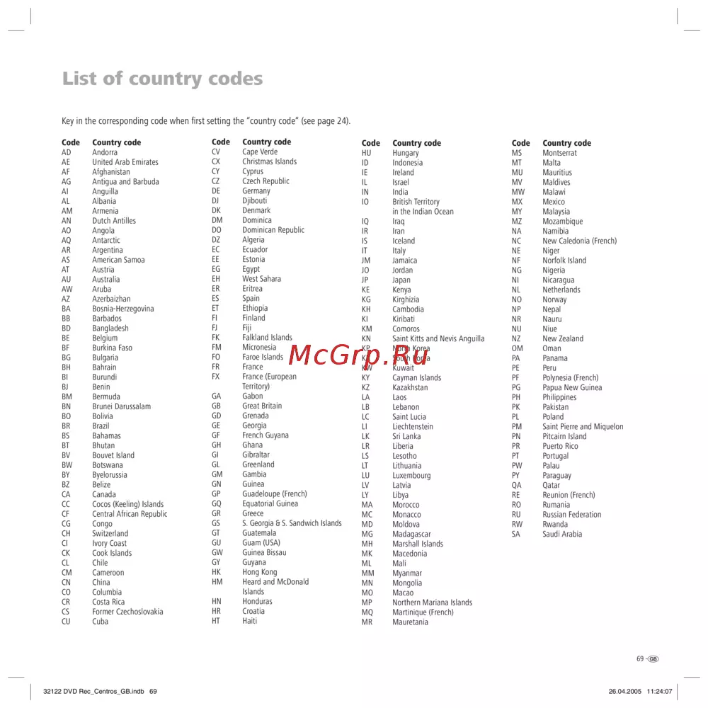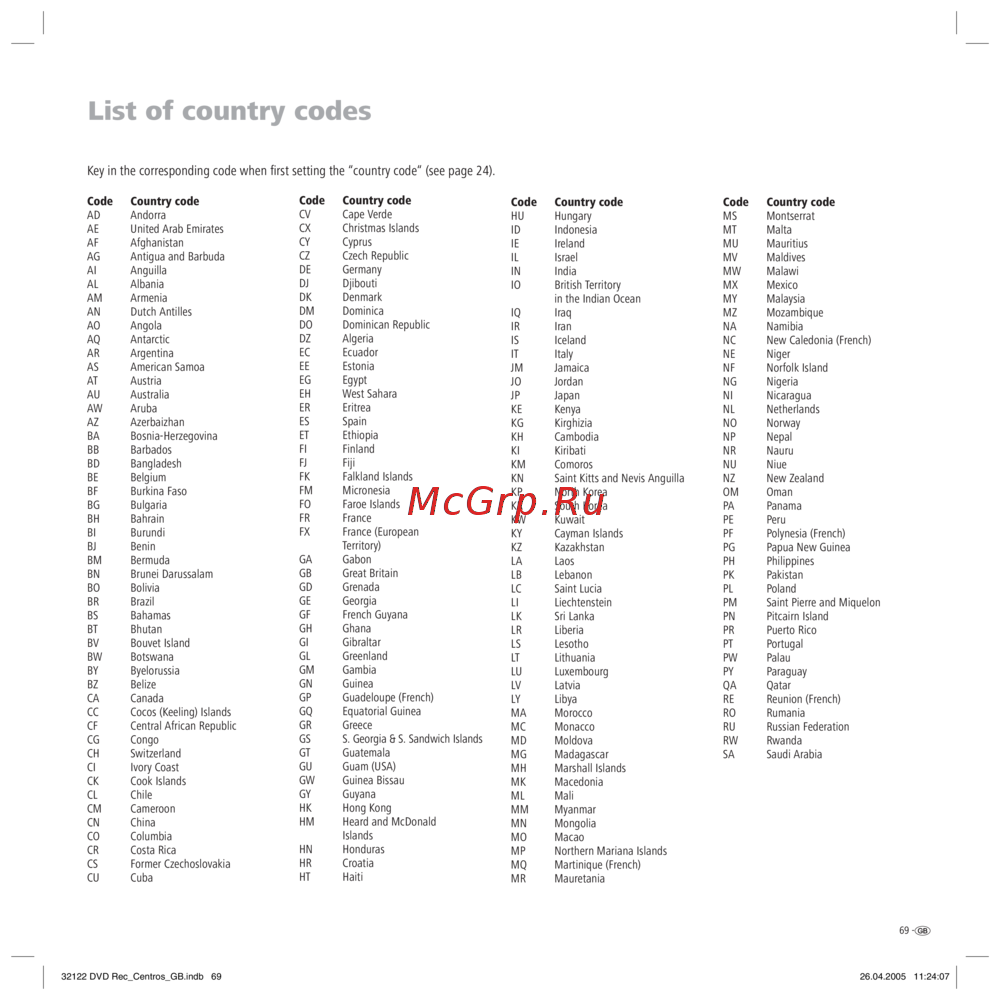 - Key in the corresponding code when fi rst setting the country code see page 24 p.69