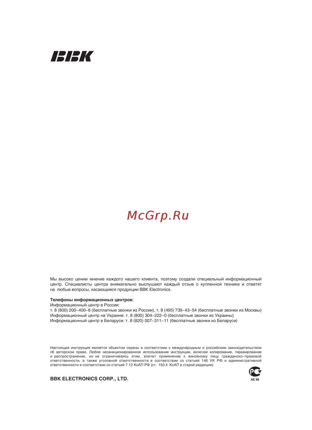 - Bbk electronics corp ltd с основным местом деятельности по адресу 23 би би кей роад вуша чанган донгуан провинция гуандун китай выражает вам огромную признательность за ваш выбор мы сделали все возможное чтобы данное изделие удовлетворяло вашим запросам а качество соответствовало лучшим мировым образцам в случае если ваше изделие марки ввк будет нуждаться в техническом обслуживании просим вас обращаться в один из уполномоченных сервисных центров с полным списком уполномоченных сервисных центров вы можете ознакомиться на сайте www bbk ru а также позвонив в информационные центры bbk 8 800 200 400 8 бесплатные звонки из любой точки россии 8 495 739 43 54 бесплатные звонки из москвы 8 800 304 222 0 бесплатные звонки из украины 8 820 007 311 11 бесплатные звонки из беларуси уважаемые покупатели в случае возникновения вопросов или проблем связанных с продукцией bbk electronics corp ltd просим вас обращаться в письменном виде по адресу 125315 г москва а я 33 либо по электронной почте service p.49