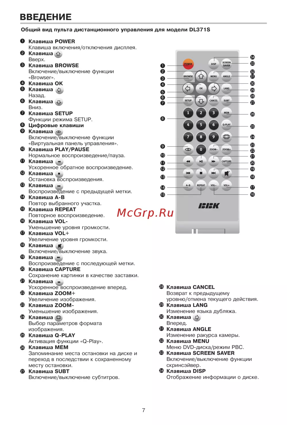 ВВЕДЕНИЕ Общий вид пульта дистанционного управления для модели DL371S О Клавиша POWER Клавиша включения отключения дисплея Клавиша О Вверх 0 Клавиша BROWSE Включение выключение функции Browser О Клавиша ОК Клавиша ф Назад Клавиша о Вниз О Клавиша SETUP Функции режима SETUP О Цифровые клавиши Клавиша Включение выключение функции Виртуальная панель управления Ф Клавиша PLAY PAUSE Нормальное воспроизведение пауза Ф Клавиша Ускоренное обратное воспроизведение Клавиша Ост ановка Зоспроиз ведения Клавиша и Воспроизв Йение с предыдущей метки Клавиша А В Повтор выбранного участка Клавиша REPEAT Повторное воспроизведение Клавиша VOLУменьшение уровня громкости Клавиша VOL Увеличение уровня громкости Клавиша Включение выключение звука Клавиша Воспроизведение с последующей метки Ф Клавиша CAPTURE Сохранение картинки в качестве заставки Ф Клавиша Ускоренно воспроизведение вперед Ф Клавиша ZOOM Увеличение изображения Ф Клавиша ZOOMУменьшение изображения Ф Клавиша S Выбор параметров формата изображения ф Клавиша Q PLAY Активация функции О Р1ау ф Клавиша МЕМ Запоминание места остановки на диске и переход в последствии к сохраненному месту остановки Ф Клавиша SUBT Включение выключение субтитров ф Клавиша CANCEL Возврат к предыдущему уровню отмена текущего действия Ф Клавиша LANG Изменение языка дубляжа Ф Клавиша ф Вперед Ф Клавиша ANGLE Изменение ракурса камеры Ф Клавиша MENU Меню DVD диска режим РВС ф Клавиша SCREEN SAVER Включение выключение функции скринсэйвер Ф Клавиша DISP Отображение информации о диске 7
