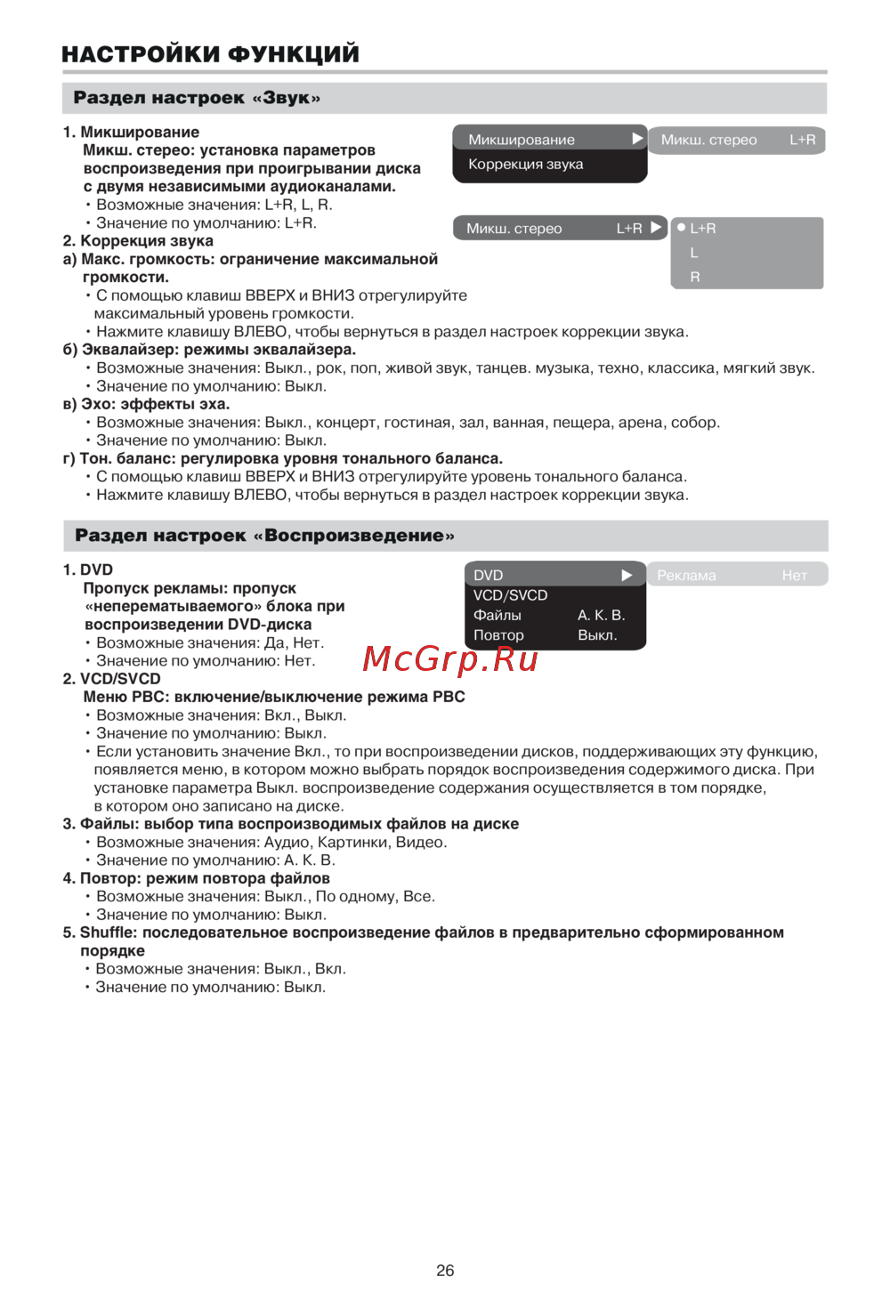 НАСТРОИКИ ФУНКЦИИ Раздел настроек Звук 1 Микширование Микширование Микш стерео L R Микш стерео установка параметров оррекцил звука воспроизведения при проигрывании диска с двумя независимыми аудиоканалами Возможные значения Е Н и R Значение по умолчанию Е В Микш стерео L R 2 Коррекция звука а Макс громкость ограничение максимальной громкости С помощью клавиш ВВЕРХ и ВНИЗ отрегулируйте максимальный уровень громкости Нажмите клавишу ВЛЕВО чтобы вернуться в раздел настроек коррекции звука б Эквалайзер режимы эквалайзера Возможные значения Выкл рок поп живой звук танцев музыка техно классика мягкий звук Значение по умолчанию Выкл в Эхо эффекты эха Возможные значения Выкл концерт гостиная зал ванная пещера арена собор Значение по умолчанию Выкл г Тон баланс регулировка уровня тонального баланса С помощью клавиш ВВЕРХ и ВНИЗ отрегулируйте уровень тонального баланса Нажмите клавишу ВЛЕВО чтобы вернуться в раздел настроек коррекции звука Раздел настроек Воспроизведение 1 DVD DVD Пропуск рекламы пропуск VCD SVCD неперематываемого блока при Файлы А К В воспроизведении DVD диска Повтор Выкл Возможные значения Да Нет Значение поумолчанию Нет 2 VCD SVCD Меню РВС включение выключение режима РВС Возможные значения Вкл Выкл Значение поумолчанию Выкл Если установить значение Вкл то при воспроизведении дисков поддерживающих эту функцию появляется меню в котором можно выбрать порядок воспроизведения содержимого диска При установке параметра Выкл воспроизведение содержания осуществляется в том порядке в котором оно записано надиске 3 Файлы выбор типа воспроизводимых файлов на диске Возможные значения Аудио Картинки Видео Значение поумолчанию А К В 4 Повтор режим повтора файлов Возможные значения Выкл По одному Все Значение поумолчанию Выкл 5 Shuffle последовательное воспроизведение файлов в предварительно сформированном порядке Возможные значения Выкл Вкл Значение поумолчанию Выкл 26