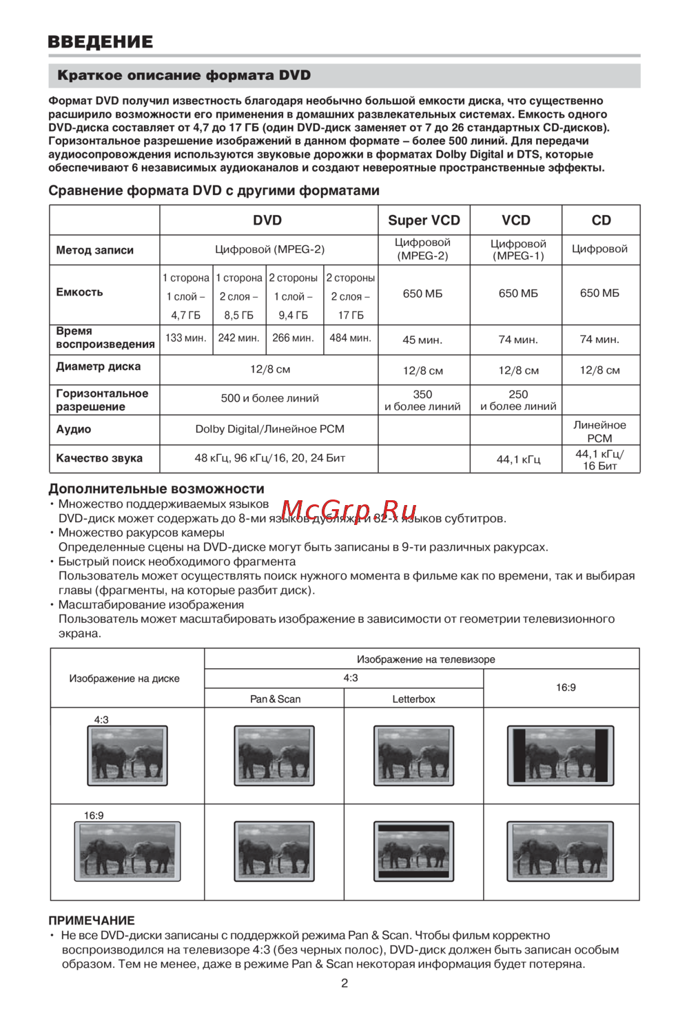 ВВЕДЕНИЕ Краткое описание формата DVD Формат DVD получил известность благодаря необычно большой емкости диска что существенно расширило возможности его применения в домашних развлекательных системах Емкость одного DVD диска составляет от4 7 до 17 ГБ один DVD диск заменяет от 7 до 26 стандартных CD дисков Горизонтальное разрешение изображений в данном формате более 500 линий Для передачи аудиосопровождения используются звуковые дорожки в форматах Dolby Digital и DTS которые обеспечивают 6 независимых аудиоканалов и создают невероятные пространственные эффекты Сравнение формата DVD с другими форматами DVD Метод записи Емкость Время воспроизведения Диаметр диска Г оризонтальное разрешение Цифровой MPEG 2 1 сторона 1 сторона 2 стороны 2 стороны 1 слой 2 слоя 1 слой 2 слоя 4 7 ГБ 8 5 ГБ 9 4 ГБ 17 ГБ 133 мин 242 мин 266 мин 484мин Super VCD VCD Цифровой MPEG 2 Цифровой MPEG 1 CD Цифровой 650 МБ 650 МБ 650 МБ 45 мин 74 мин 74 мин 12 8 см 12 8 см 12 8 см 12 8 см 500 и более линий 350 и более линий Аудио Dolby Digital Линейное PCM Качество звука 48 кГц 96 кГц 16 20 24 Бит 250 и более линий Линейное PCM 44 1 кГц 44 1 кГц 16 Бит Дополнительные возможности Множество поддерживаемых языков ОУО диск может содержать до 8 ми языков дубляжа и 32 х языков субтитров Множество ракурсов камеры Определенные сцены на ОУО диске могут быть записаны в 9 ти различных ракурсах Быстрый поиск необходимого фрагмента Пользователь может осуществлять поиск нужного момента в фильме как по времени так и выбирая главы фрагменты на которые разбит диск Масштабирование изображения Пользователь может масштабировать изображение в зависимости от геометрии телевизионного экрана ПРИМЕЧАНИЕ Не все DVD диски записаны с поддержкой режима Pan Scan Чтобы фильм корректно воспроизводился на телевизоре 4 3 без черных полос DVD диск должен быть записан особым образом Тем не менее даже в режиме Pan Scan некоторая информация будет потеряна 2