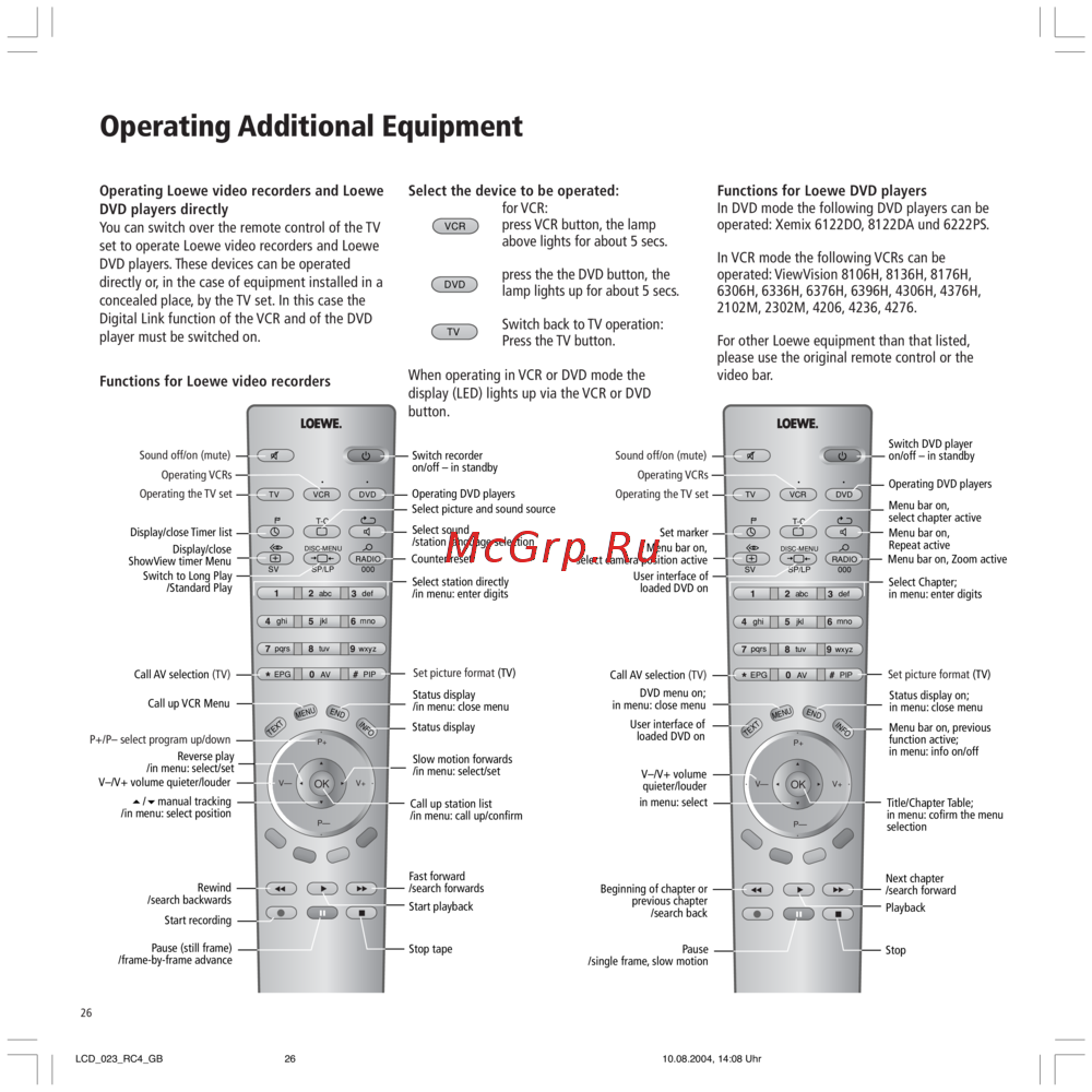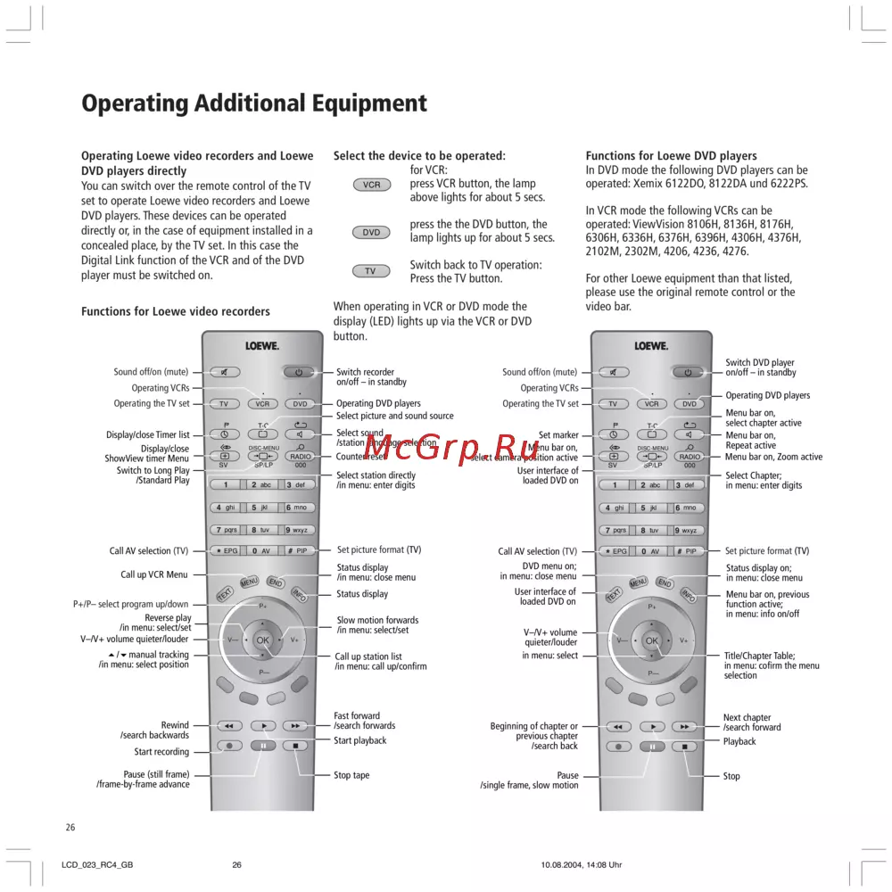 - Operating loewe video recorders and loewe dvd players directly you can switch over the remote control of the tv set to operate loewe video recorders and loewe dvd players these devices can be operated directly or in the case of equipment installed in a concealed place by the tv set in this case the digital link function of the vcr and of the dvd player must be switched on p.26