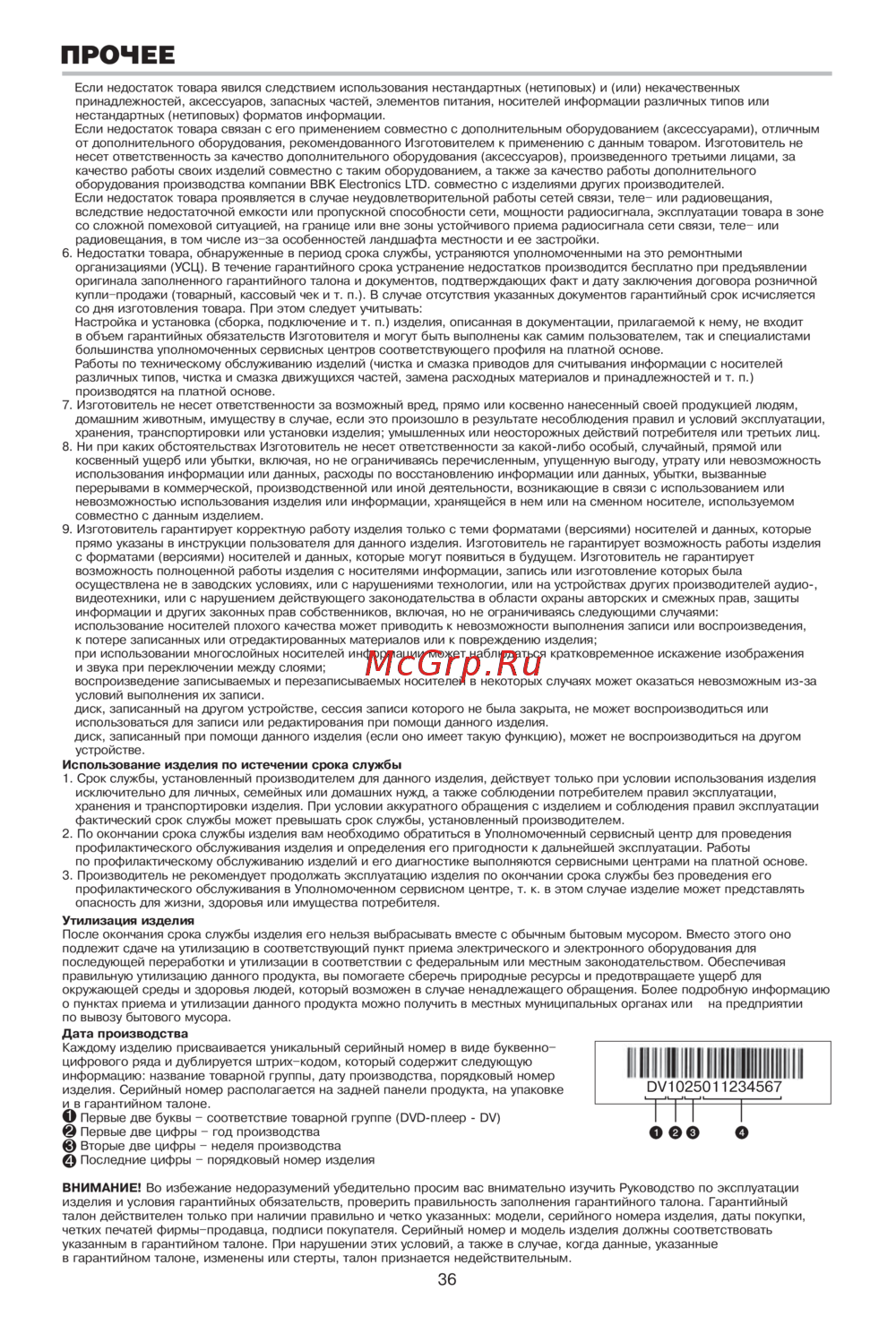 ПРОЧЕЕ Если недостаток товара явился следствием использования нестандартных нетиповых и или некачественных при пдлеж1юстей аксессуаров запасных частей элементов питания носителей информации различных типов или нестандартных нетиповых форматов информации Если недостаток товара связан с его применением совместно с дополнительным оборудованием аксессуарами отличны от дополнительного оборудования рекомендованного Изготовителем к применению с данньм товаром Изготовитель не несет ответстветость за качество допол1ителыюго оборудования аксессуаров произведенного третьими лиюми за качество работы своих изделий совместно с таким оборудованием а также за качество работы дополнителыего оборудования производства компании ВВК Electronics LTD совместно с изделиями других производителей Если 1едостаток товара проявляется в случае неудовлетворителыюй работы сетей связи теле или радиовещания вследствие 1едостаточной емкости или пропускной способности сети мощности радиосигнала эксплуатации товар в зоне со сложной помеховой ситуацией на границе или вне зоны устойчивого приема радиосигнала сети связи теле или радиовещания в тем числе из за особенностей ландшафта местности и ее застройки 6 Недостатки товара обнеружетье в период срока службы устраняются уполнюмоченньми на это ремонтными организациями УСЦ В течение гарантийного срока устранение недостатков производится бесплатно при предъявлении оригинала заполненного гарантийного талона и документов подтверждающих факт и дату заключения договора рознично купли продажи товарный кассовый чек и т п В случае отсутствия указанных документов гарантийный срок исчисляется со дня изготовления товара При этсм следует учитывать Настройка и установка сборка подключение и т п изделия описанная в документации прилагаемой к нему не входит в объем гарантийных обязательств Изготовителя и могут быть выполнены как самим пользователем так и специалистам большинства уголномочеиных сервисных центров соответствующего профиля ни платной основе Работы по техническому обслуживанию изделий чистка и смазка приводов для считывания информации с носителей различных типов чистка и смазка движущихся частей замена расходных материалов и принадлежностей и т п производятся на платной основе 7 Изготовитель не несет ответственности за возможный вред прямо или косвенно нанесенный своей продукцией людям домашним животным имуществу в случае если это произошло в результате несоблюдения правил и условий эксплуатац хранения транспортировки или установки изделия умышленных или неосторожных действий потребителя или третьих ли 8 Ни при каких обстоятельствах Изготовитель не несет ответственности за какой либо особый случайный прямой или косвенный ущерб или убытки включая ню не ограничиваясь перечисленньм упущенную выгоду утрагу или невозможнос использования информации или данных расходы по восстановлению информации или данных убытки вызванные перерывами в коммерческой производственной или иной деятельности возникающие в связи с использованием или о возможностью использования изделия или информации хранящейся в нем или ш сменном носителе используемом совместно с данньм изделием 9 Изготовитель гарантирует корректную работу изделия только с теми форматами версиями носителей и да