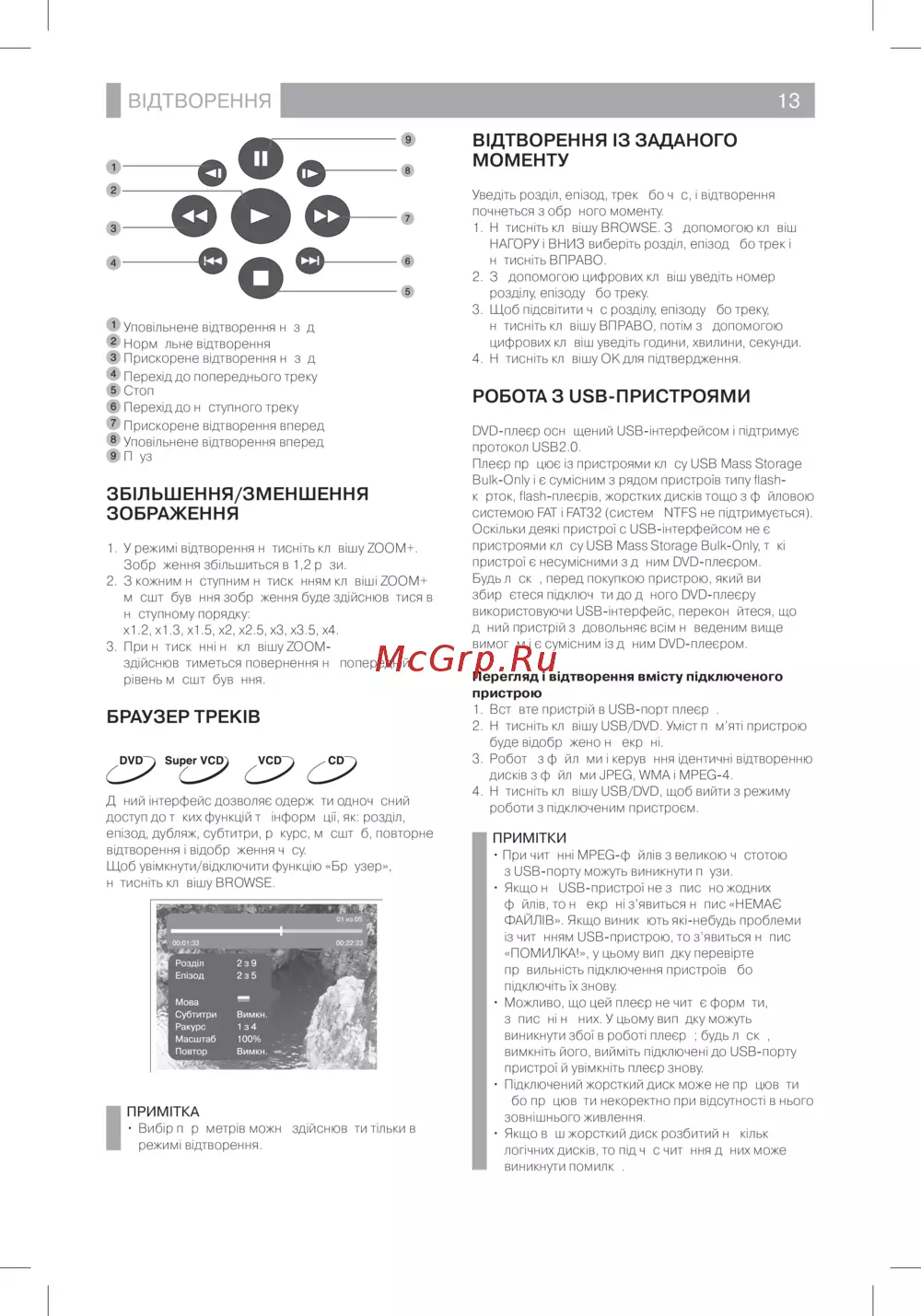 - Деякі диски записані в будь якому з підтримуваних форматів на будь якому із сумісних типів носіїв можуть не відтворюватися або відтворюватися некоректно через особливості їхнього запису p.47