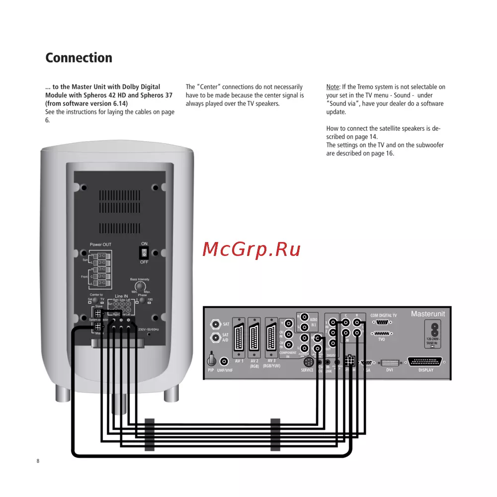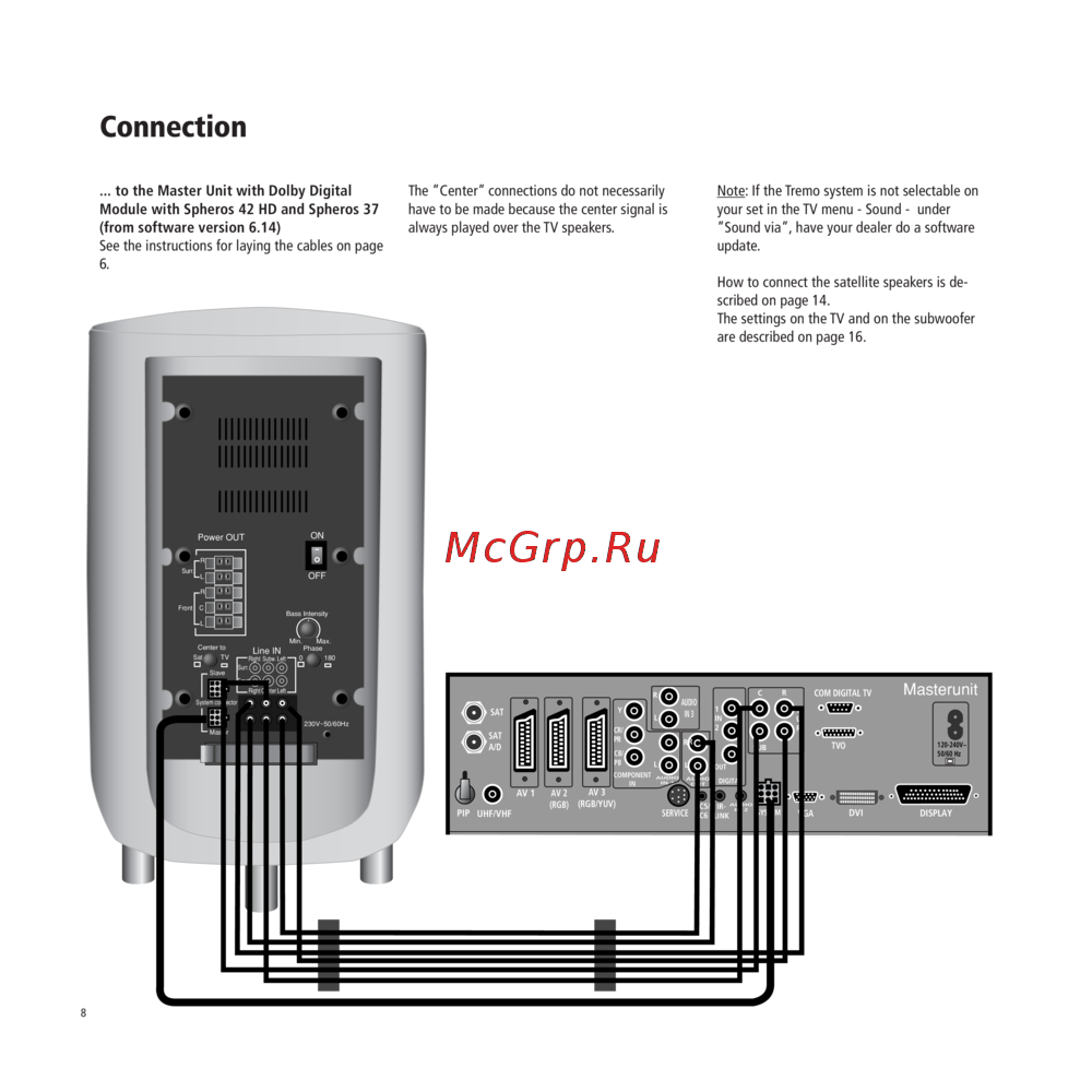 - To the master unit with dolby digital module with spheros 42 hd and spheros 37 from software version 6 4 see the instructions for laying the cables on page 6 p.8