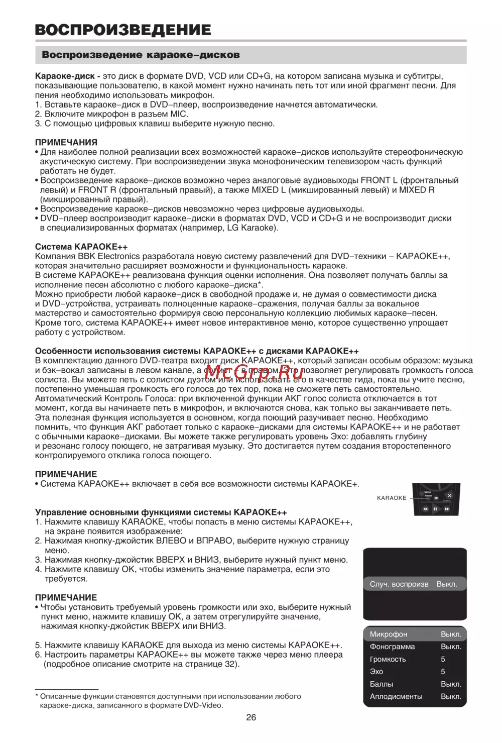 ВОСПРОИЗВЕДЕНИЕ Воспроизведение караоке дисков Караоке диск это диск в формате DVD VCD или CD G на котором записана музыка и субтитры показывающие пользователю в какой момент нужно начинать петь тот или иной фрагмент песни Для пения необходимо использовать микрофон 1 Вставьте караоке диск в DVD плеер воспроизведение начнется автоматически 2 Включите микрофон в разъем MIC 3 С помощью цифровых клавиш выберите нужную песню ПРИМЕЧАНИЯ Для наиболее полной реализации всех возможностей караоке дисков используйте стереофоническую акустическую систему При воспроизведении звука монофоническим телевизором часть функций работать не будет Воспроизведение караоке дисков возможно через аналоговые аудиовыходы FRONT L фронтальный левый и FRONT R фронтальный правый а также MIXED L микшированный левый и MIXED R микшированный правый Воспроизведение караоке дисков невозможно через цифровые аудиовыходы DVD плеер воспроизводит караоке диски в форматах DVD VCD и CD G и не воспроизводит диски в специализированных форматах например LG Karaoke Система КАРАОКЕ Компания ВВК Electronics разработала новую систему развлечений для DVD техники КАРАОКЕ которая значительно расширяет возможности и функциональность караоке В системе КАРАОКЕ реализована функция оценки исполнения Она позволяет получать баллы за исполнение песен абсолютно с любого караоке диска Можно приобрести любой караоке диск в свободной продаже и не думая о совместимости диска и DVD устройства устраивать полноценные караоке сражения получая баллы за вокальное мастерство и самостоятельно формируя свою персональную коллекцию любимых караоке песен Кроме того система КАРАОКЕ имеет новое интерактивное меню которое существенно упрощает работу с устройством Особенности использования системы КАРАОКЕ с дисками КАРАОКЕ В комплектацию данного ОУО театра входит диск КАРАОКЕ который записан особым образом музыка и бэк вокал записаны в левом канале а солист в правом Это позволяет регулировать громкость голоса солиста Вы можете петь с солистом дуэтом или использовать его в качестве гида пока вы учите песню постепенно уменьшая громкость его голоса до тех пор пока не сможете петь самостоятельно Автоматический Контроль Голоса при включенной функции АКГ голос солиста отключается в тот момент когда вы начинаете петь в микрофон и включаются снова как только вы заканчиваете петь Эта полезная функция используется в основном когда поющий разучивает песню Необходимо помнить что функция АКГ работает только с караоке дисками для системы КАРАОКЕ и не работает с обычными караоке дисками Вы можете также регулировать уровень Эхо добавлять глубину и резонанс голосу поющего не затрагивая музыку Это достигается путем создания второстепенного контролируемого отклика голоса поющего ПРИМЕЧАНИЕ Система КАРАОКЕ включает в себя все возможности системы КАРАОКЕ Управление основными функциями системы КАРАОКЕ 1 Нажмите клавишу KARAOKE чтобы попасть в меню системы КАРАОКЕ на экране появится изображение 2 Нажимая кнопку джойстик ВЛЕВО и ВПРАВО выберите нужную страницу меню 3 Нажимая кнопку джойстик ВВЕРХ и ВНИЗ выберите нужный пункт меню 4 Нажмите клавишу ОК чтобы изменить значение параметра если это требуется ПРИМЕЧАНИЕ Чтобы установить требуемый уровень громкости или эхо выберите нужный пункт меню нажмите клавишу ОК а затем о