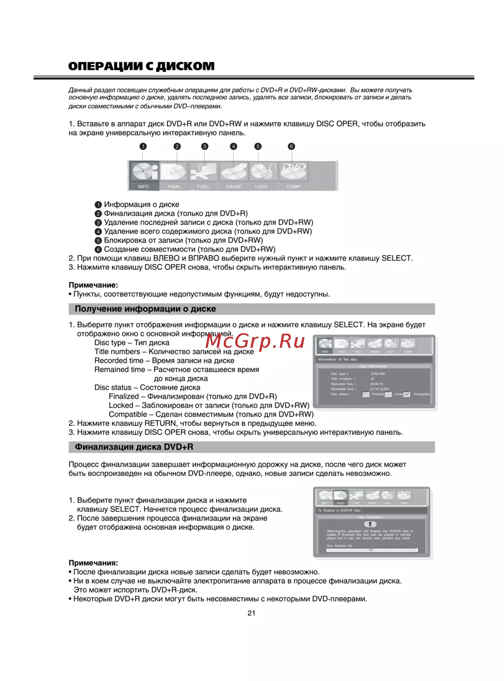 ОПЕРАЦИИ С ДИСКОМ Данный раздел посвящен служебным операциям для работы с ВУО Я и DVD RW дисками Вы можете получать основную информацию о диске удалять последнюю запись удалять все записи блокировать от записи и делать диски совместимыми с обычными ОУВ плеерами 1 Вставьте в аппарат диск DVD R или DVD RW и нажмите клавишу DISC OPER чтобы отобразить на экране универсальную интерактивную панель О Информация о диске О Финализация диска только для DVD R 0 Удаление последней записи с диска только для DVD RW О Удаление всего содержимого диска только для DVD RW 0 Блокировка от записи только для DVD RW 0 Создание совместимости только для DVD RW 2 При помощи клавиш ВЛЕВО и ВПРАВО выберите нужный пункт и нажмите клавишу SELECT 3 Нажмите клавишу DISC OPER снова чтобы скрыть интерактивную панель Примечание Пункты соответствующие недопустимым функциям будут недоступны Получение информации о диске 1 Выберите пункт отображения информации о диске и нажмите клавишу SELECT На экране будет отображено окно с основной информацией 1 Disc type Тип диска Title numbers Количество записей на диске Recorded time Время записи на диске Remained time Расчетное оставшееся время до конца диска Disc status Состояние диска Finalized Финализирован только для DVD R Locked Заблокирован от записи только для DVD RW Compatible Сделан совместимым только для DVD RW 2 Нажмите клавишу RETURN чтобы вернуться в предыдущее меню 3 Нажмите клавишу DISC OPER снова чтобы скрыть универсальную интерактивную панель й S с е INFO FINAL T DEL ERASE LOCK COMP Финализация диска DVD R Процесс финализации завершает информационную дорожку на диске после чего диск может быть воспроизведен на обычном ОУО плеере однако новые записи сделать невозможно 1 Выберите пункт финализации диска и нажмите клавишу SELECT Начнется процесс финализации диска 2 После завершения процесса финализации на экране будет отображена основная информация о диске Примечания После финализации диска новые записи сделать будет невозможно Ни в коем случае не выключайте электропитание аппарата в процессе финализации диска Это может испортить ОУО Н диск Некоторые ОУО Н диски могут быть несовместимы с некоторыми ОУО плеерами 21