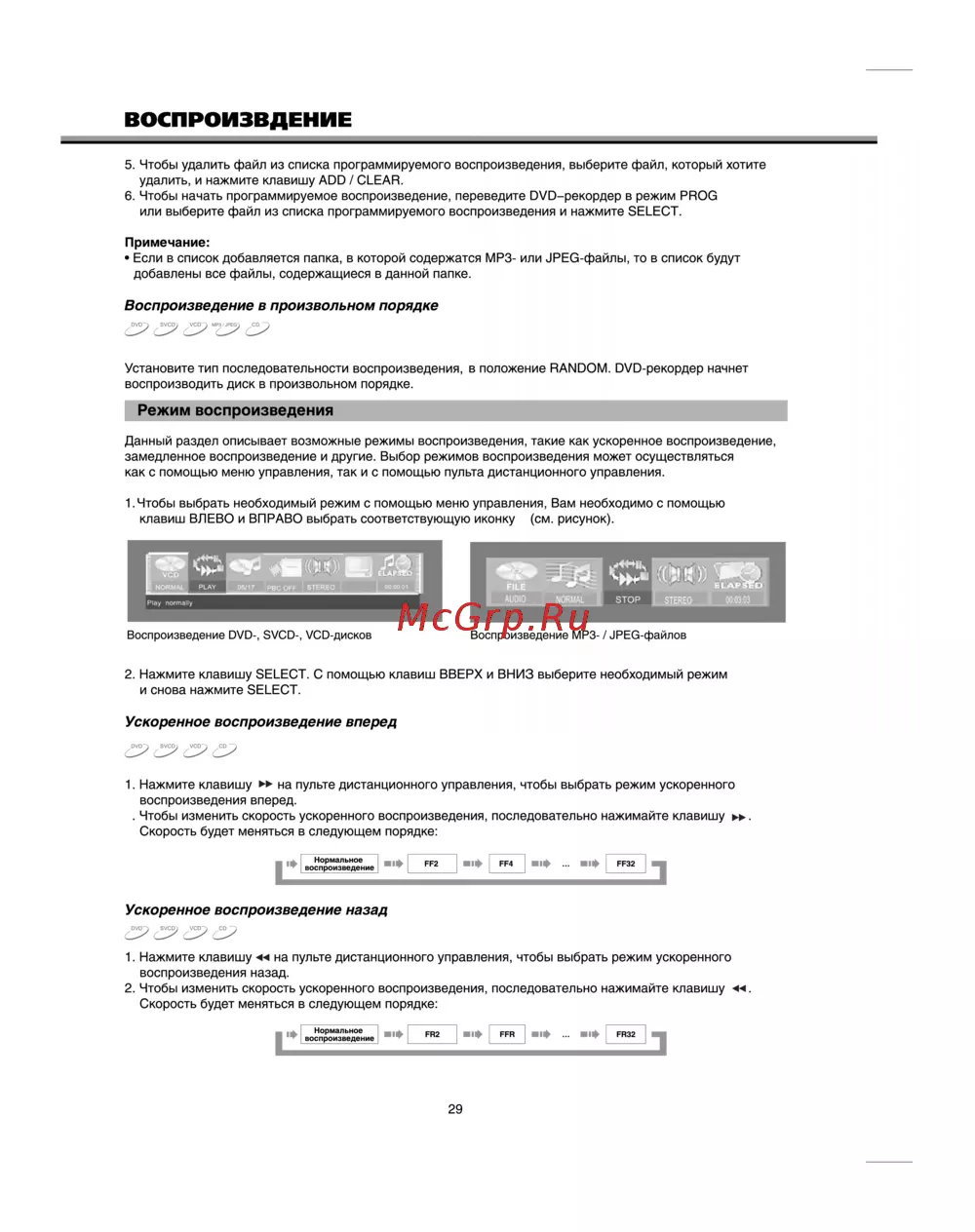 ВОСПРОИЗВДЕНИЕ 5 Чтобы удалить файл из списка программируемого воспроизведения выберите файл который хотите удалить и нажмите клавишу ADD CLEAR 6 Чтобы начать программируемое воспроизведение переведите DVD рекордер в режим PROG или выберите файл из списка программируемого воспроизведения и нажмите SELECT Примечание Если в список добавляется папка в которой содержатся МРЗ или ЗРЕО файлы то в список будут добавлены все файлы содержащиеся в данной папке Воспроизведение в произвольном порядке DVD SVCD VCD МРЗ JPEG CD Установите тип последовательности воспроизведения в положение RANDOM DVD рекордер начнет воспроизводить диск в произвольном порядке Режим воспроизведения Данный раздел описывает возможные режимы воспроизведения такие как ускоренное воспроизведение замедленное воспроизведение и другие Выбор режимов воспроизведения может осуществляться как с помощью меню управления так и с помощью пульта дистанционного управления 1 Чтобы выбрать необходимый режим с помощью меню управления Вам необходимо с помощью клавиш ВЛЕВО и ВПРАВО выбрать соответствующую иконку см рисунок Воспроизведение DVD SVCD VCD дисков Воспроизведение МРЗ JPEG файлов 2 Нажмите клавишу SELECT С помощью клавиш ВВЕРХ и ВНИЗ выберите необходимый режим и снова нажмите SELECT Ускоренное воспроизведение вперед 1 Нажмите клавишу на пульте дистанционного управления чтобы выбрать режим ускоренного воспроизведения вперед Чтобы изменить скорость ускоренного воспроизведения последовательно нажимайте клавишу Скорость будет меняться в следующем порядке Нормальное воспроизведение ф FF4 FF2 FF32 Ускоренное воспроизведение назад 1 Нажмите клавишу на пульте дистанционного управления чтобы выбрать режим ускоренного воспроизведения назад 2 Чтобы изменить скорость ускоренного воспроизведения последовательно нажимайте клавишу Скорость будет меняться в следующем порядке Нормальное воспроизведение 1ф FFR FR2 29 FR32