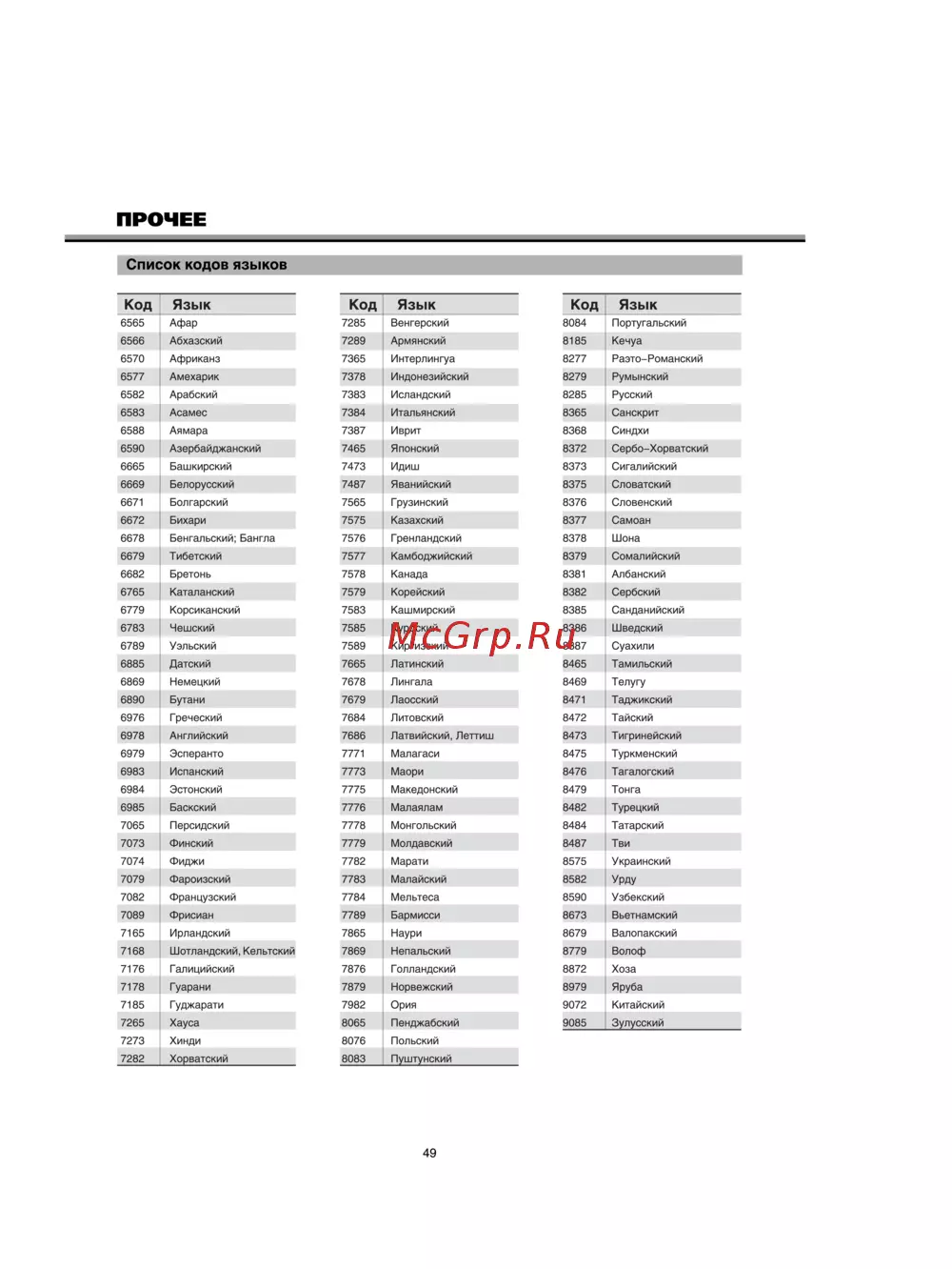 ПРОЧЕЕ Список кодов языков Код Язык Код Язык Код Язык 6565 Афар 7285 Венгерский 8084 Португальский 6566 Абхазский 7289 Армянский 8185 Кечуа 6570 Африканз 7365 Интерлингуа 8277 Раэто Романский 6577 Амехарик 7378 Индонезийский 8279 Румынский 6582 Арабский 7383 Исландский 8285 Русский 6583 Асамес 7384 Итальянский 8365 Санскрит 6588 Аямара 7387 Иврит 8368 Синдхи 6590 Азербайджанский 7465 Японский 8372 Сербо Хорватский 6665 Башкирский 7473 Идиш 8373 Сигалийский 6669 Белорусский 7487 Яванийский 8375 Словатский 6671 Болгарский 7565 Грузинский 8376 Словенский 6672 Бихари 7575 Казахский 8377 Самоан 6678 Бенгальский Бангла 7576 Гренландский 8378 Шона 6679 Тибетский 7577 Камбоджийский 8379 Сомалийский 6682 Бретонь 7578 Канада 8381 Албанский 6765 Каталанский 7579 Корейский 8382 Сербский 6779 Корсиканский 7583 Кашмирский 8385 Санданийский 6783 Чешский 7585 Курдский 8386 Шведский 6789 Уэльский 7589 Киргизский 8387 Суахили 6885 Датский 7665 Латинский 8465 Тамильский 6869 Немецкий 7678 Лингала 8469 Телугу 6890 Бутани 7679 Лаосский 8471 Таджикский 6976 Греческий 7684 Литовский 8472 Тайский 6978 Английский 7686 Латвийский Леттиш 8473 Тигринейский 6979 Эсперанто 7771 Малагаси 8475 Туркменский 6983 Испанский 7773 Маори 8476 Тагалогский 6984 Эстонский 7775 Македонский 8479 Тонга 6985 Баскский 7776 Малаялам 8482 Турецкий 7065 Персидский 7778 Монгольский 8484 Татарский 7073 Финский 7779 Молдавский 8487 Тви 7074 Фиджи 7782 Марати 8575 Украинский 7079 Фароизский 7783 Малайский 8582 Урду 7082 Французский 7784 Мельтеса 8590 Узбекский 7089 Фрисиан 7789 Бармисси 8673 Вьетнамский 7165 Ирландский 7865 Наури 8679 Валопакский 7168 Шотландский Кельтский 7869 Непальский 8779 Волоф 7176 Галицийский 7876 Голландский 8872 Хоза 7178 Гуарани 7879 Норвежский 8979 Яруба 7185 Г уджарати 7982 Ория 9072 Китайский 7265 Хауса 8065 Пенджабский 9085 Зулусский 7273 Хинди 8076 Польский 7282 Хорватский 8083 Пуштунский 49