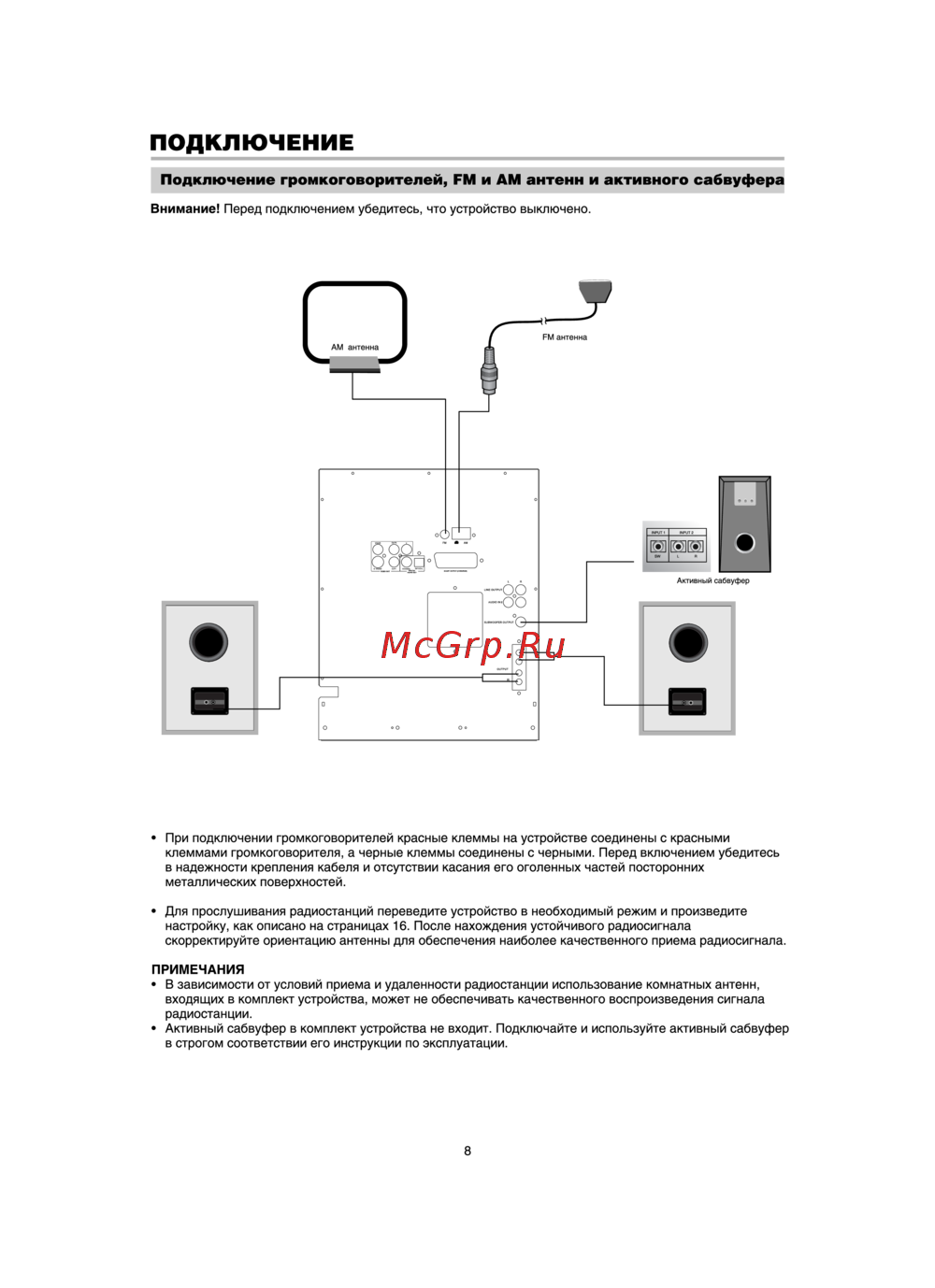 ПОДКЛЮЧЕНИЕ Подключение громкоговорителей РМ и АМ антенн и активного сабвуфера Внимание Перед подключением убедитесь что устройство выключено При подключении громкоговорителей красные клеммы на устройстве соединены с красными клеммами громкоговорителя а черные клеммы соединены с черными Перед включением убедитесь в надежности крепления кабеля и отсутствии касания его оголенных частей посторонних металлических поверхностей Для прослушивания радиостанций переведите устройство в необходимый режим и произведите настройку как описано на страницах 16 После нахождения устойчивого радиосигнала скорректируйте ориентацию антенны для обеспечения наиболее качественного приема радиосигнала ПРИМЕЧАНИЯ В зависимости от условий приема и удаленности радиостанции использование комнатных антенн входящих в комплект устройства может не обеспечивать качественного воспроизведения сигнала радиостанции Активный сабвуфер в комплект устройства не входит Подключайте и используйте активный сабвуфер в строгом соответствии его инструкции по эксплуатации 8