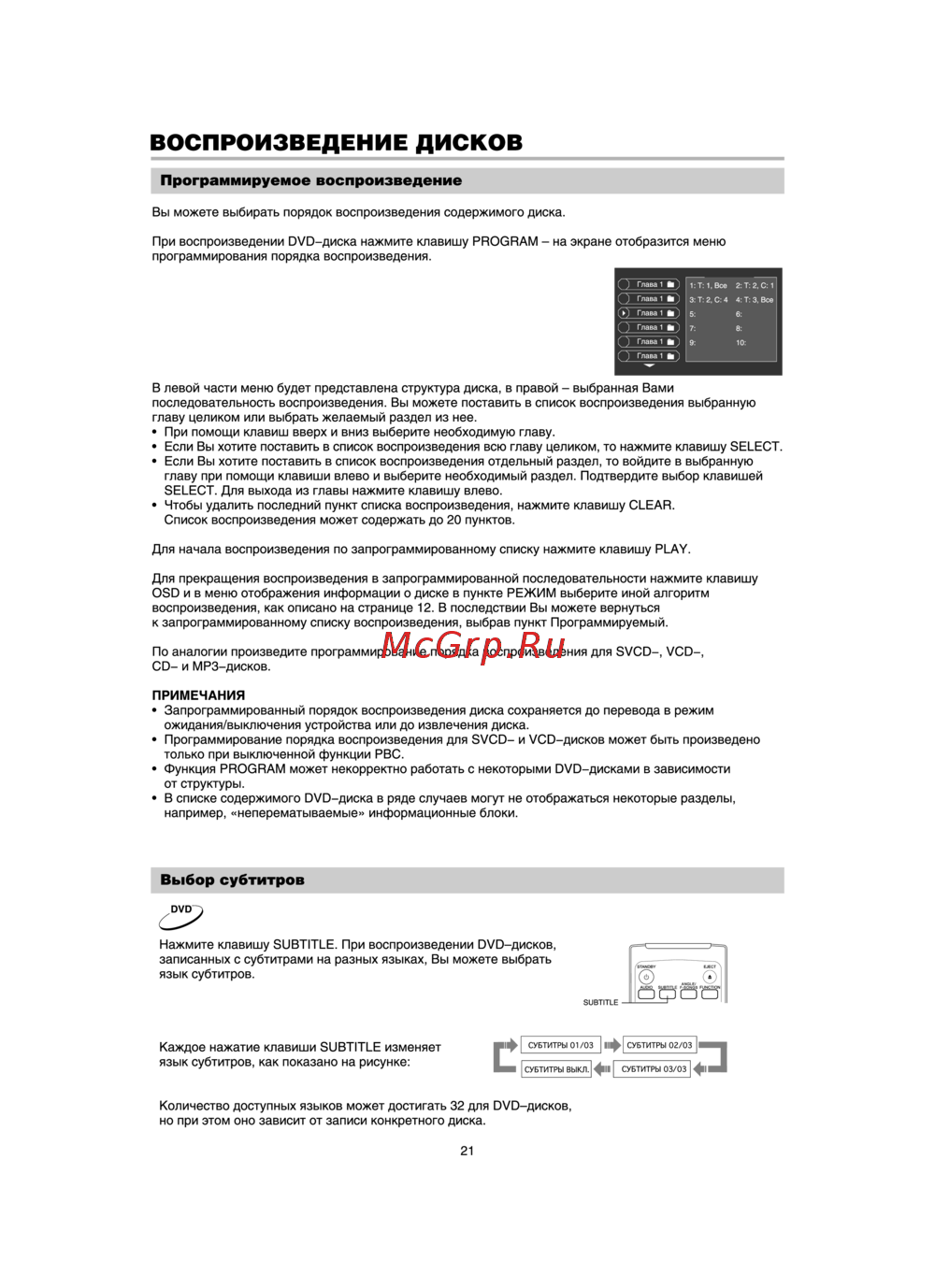 ВОСПРОИЗВЕДЕНИЕ ДИСКОВ Программируемое воспроизведение Вы можете выбирать порядок воспроизведения содержимого диска При воспроизведении DVD диска нажмите клавишу PROGRAM на экране отобразится меню программирования порядка воспроизведения В левой части меню будет представлена структура диска в правой выбранная Вами последовательность воспроизведения Вы можете поставить в список воспроизведения выбранную главу целиком или выбрать желаемый раздел из нее При помощи клавиш вверх и вниз выберите необходимую главу Если Вы хотите поставить в список воспроизведения всю главу целиком то нажмите клавишу SELECT Если Вы хотите поставить в список воспроизведения отдельный раздел то войдите в выбранную главу при помощи клавиши влево и выберите необходимый раздел Подтвердите выбор клавишей SELECT Для выхода из главы нажмите клавишу влево Чтобы удалить последний пункт списка воспроизведения нажмите клавишу CLEAR Список воспроизведения может содержать до 20 пунктов Для начала воспроизведения по запрограммированному списку нажмите клавишу PLAY Для прекращения воспроизведения в запрограммированной последовательности нажмите клавишу OSD и в меню отображения информации о диске в пункте РЕЖИМ выберите иной алгоритм воспроизведения как описано на странице 12 В последствии Вы можете вернуться к запрограммированному списку воспроизведения выбрав пункт Программируемый По аналогии произведите программирование порядка воспроизведения для SVCD VCD CD и МРЗ дисков ПРИМЕЧАНИЯ Запрограммированный порядок воспроизведения диска сохраняется до перевода в режим ожидания выключения устройства или до извлечения диска Программирование порядка воспроизведения для SVCD и VCD дисков может быть произведено только при выключенной функции РВС Функция PROGRAM может некорректно работать с некоторыми DVD дисками в зависимости от структуры В списке содержимого DVD диска в ряде случаев могут не отображаться некоторые разделы например неперематываемые информационные блоки Выбор субтитров Нажмите клавишу SUBTITLE При воспроизведении DVD дисков записанных с субтитрами на разных языках Вы можете выбрать язык субтитров SUBTITLE Каждое нажатие клавиши SUBTITLE изменяет язык субтитров как показано на рисунке Количество доступных языков может достигать 32 для DVD диcкoв но при этом оно зависит от записи конкретного диска 21