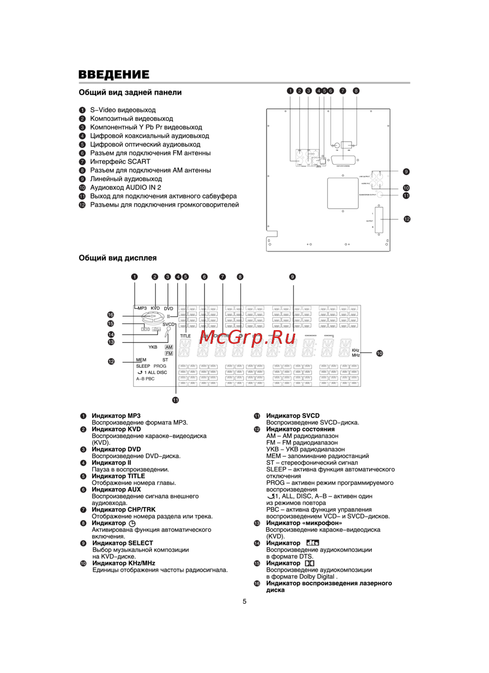 ВВЕДЕНИЕ ООО СЮО О 0 Общий вид задней панели О S Video видеовыход 0 Композитный видеовыход Q Компонентный Y Pb Рг видеовыход 0 Цифровой коаксиальный аудиовыход 0 Цифровой оптический аудиовыход 0 Разъем для подключения FM антенны О Интерфейс SCART 0 Разъем для подключения АМ антенны 0 Линейный аудиовыход ф Аудиовход AUDIO IN 2 0 Выход для подключения активного сабвуфера ф Разъемы для подключения громкоговорителей Общий вид дисплея ф ф ф ф ф ф о Индикатор MP3 Ф Индикатор SVCD Воспроизведение SVCD диска ф Индикатор состояния АМ АМ радиодиапазон FM FM радиодиапазон УКВ УКВ радиодиапазон МЕМ запоминание радиостанций ST стереофонический сигнал SLEEP активна функция автоматического отключения PROG активен режим программируемого воспроизведения 1 ALL DISC A В активен один из режимов повтора РВС активна функция управления воспроизведением VCD и SVCD дисков Ф Индикатор микрофон Воспроизведение караоке видеодиска KVD Ф Индикатор Г ГП Воспроизведение аудиокомпозиции в формате DTS Ф Индикатор Воспроизведение аудиокомпозиции в формате Dolby Digital ф Индикатор воспроизведения лазерного диска Воспроизведение формата MP3 0 Индикатор KVD Воспроизведение караоке видеодиска KVD 0 Индикатор DVD Воспроизведение DVD диска О Индикатор II Пауза в воспроизведении 0 Индикатор TITLE Отображение номера главы 0 Индикатор AUX Воспроизведение сигнала внешнего аудиовхода О Индикатор CHP TRK Отображение номера раздела или трека 0 Индикатор 3 Активирована функция автоматического включения 0 Индикатор SELECT Выбор музыкальной композиции на KVD диске ф Индикатор KHz MHz Единицы отображения частоты радиосигнала 5