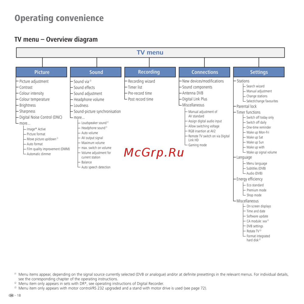 Menu items appear, depending on the signal source currently selected (DVB or analogue) and/or at definite presettings in the relevant menus. For individual details,