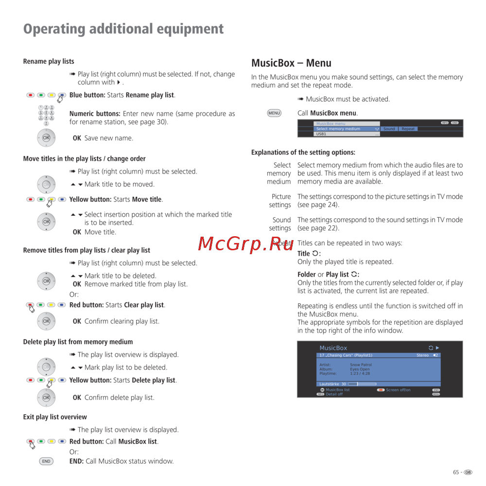 - Select title scroll with p p if necessary ok the play list is played in the musicbox status window from the marked title p.64