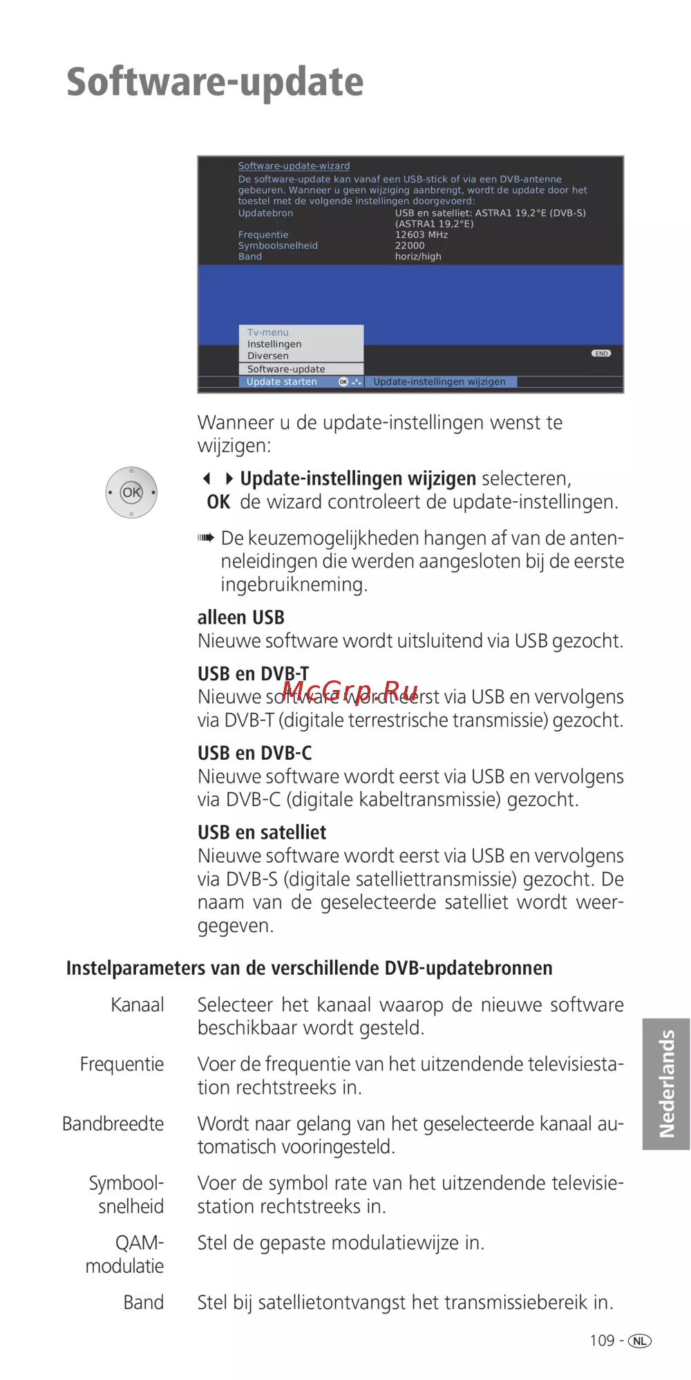 Leer hoe u de software-update-instellingen kunt wijzigen via USB of DVB. Ontdek de stappen voor het instellen van frequenties en kanalen voor een succesvolle update.