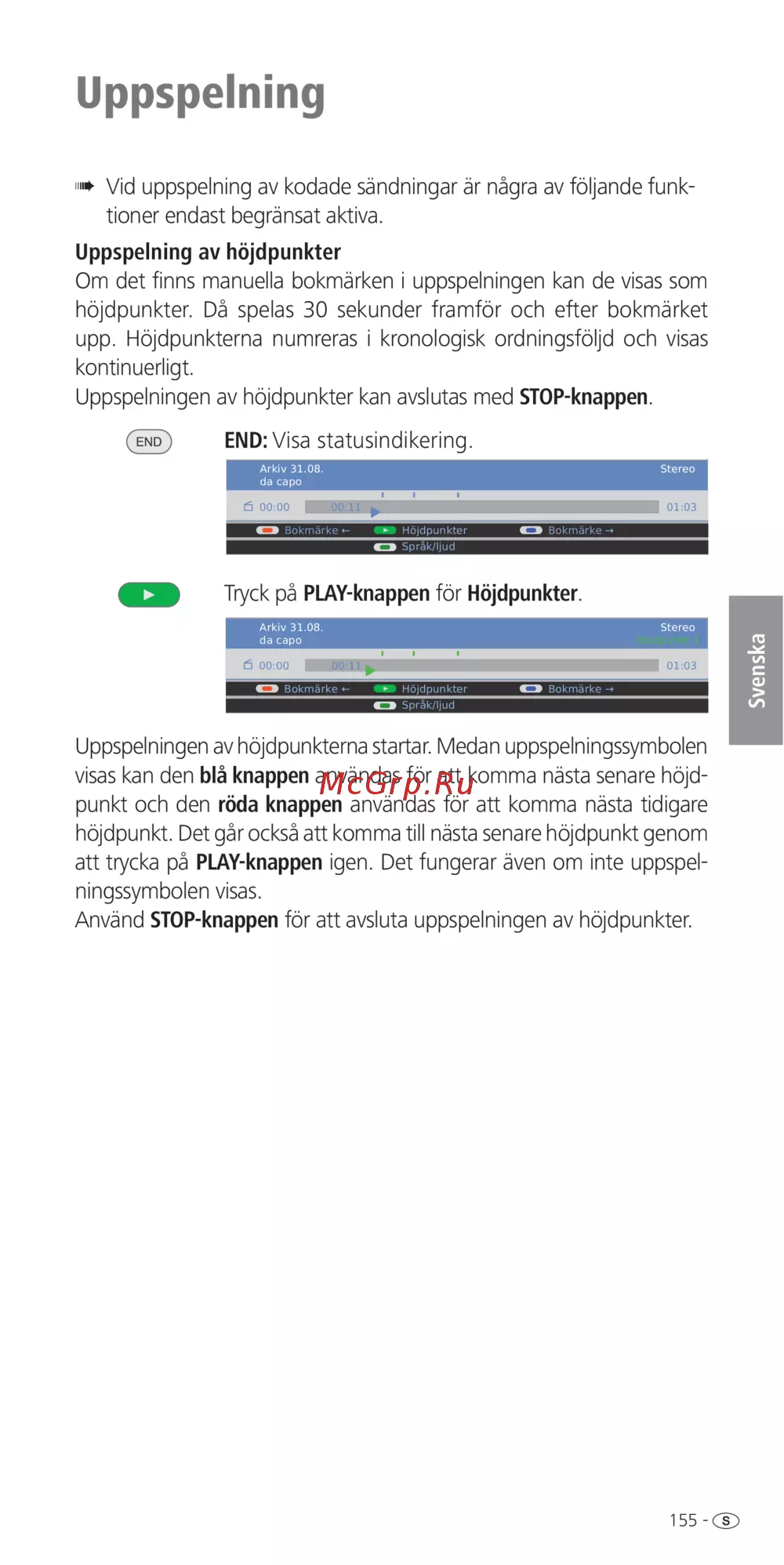 - Uppspelning av höjdpunkter om det finns manuella bokmärken i uppspelningen kan de visas som höjdpunkter då spelas 30 sekunder framför och efter bokmärket upp höjdpunkterna numreras i kronologisk ordningsföljd och visas kontinuerligt uppspelningen av höjdpunkter kan avslutas med stop knappen p.155