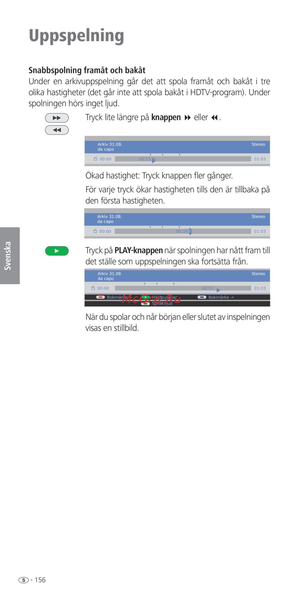 - Snabbspolning framåt och bakåt under en arkivuppspelning går det att spola framåt och bakåt i tre olika hastigheter det går inte att spola bakåt i hdtv program under spolningen hörs inget ljud p.156